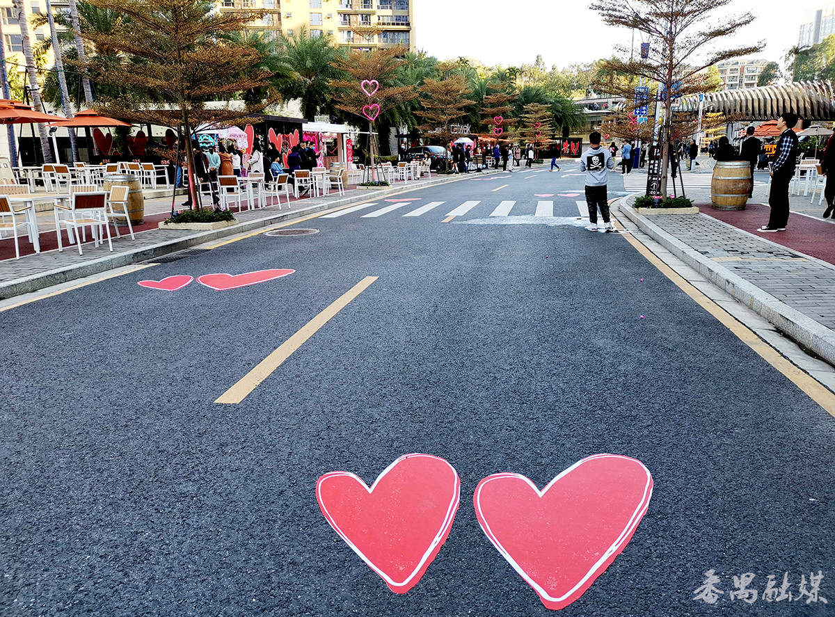 網紅打卡點「表心道」坐落在四海城東西兩區之間的萬惠二路,整條街道以浪漫的愛心妝點打造,布滿霓虹燈飾、貨櫃打卡點等心動元素,打造沉浸式的愛情主題街區。街道內布滿愛心的貨櫃,藏著滿滿驚喜,每一個打卡點都獨出機杼。現場還有歐洲著名音樂家現場演繹鋼琴、手風琴等現代西洋樂器的浪漫音符,打造豪華視聽盛宴。