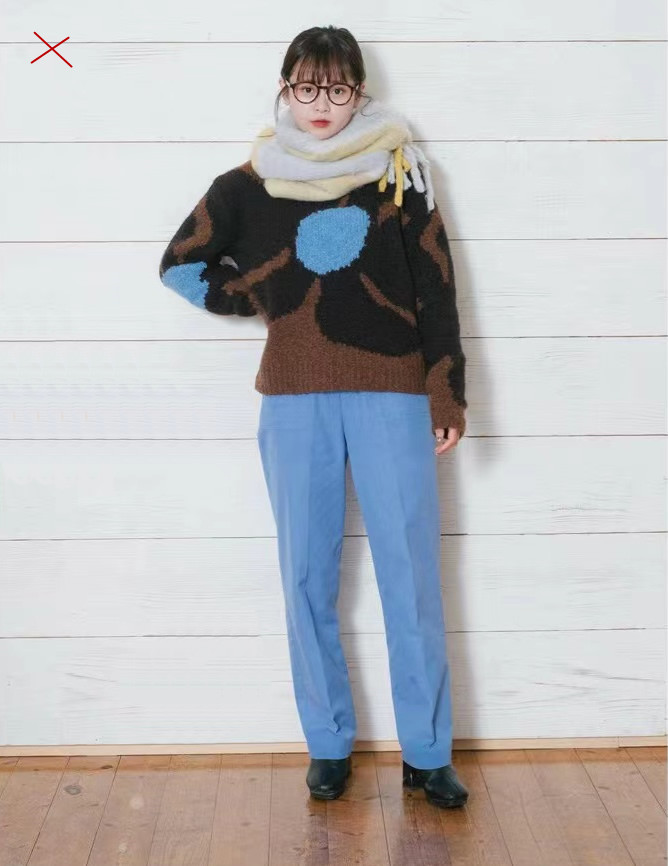 毛衣與褲子五五對比明顯,直接切割縱向比例,再加上一雙黑色鞋子的突兀點綴,雖與衣服呼應,但卻破壞美感比例。