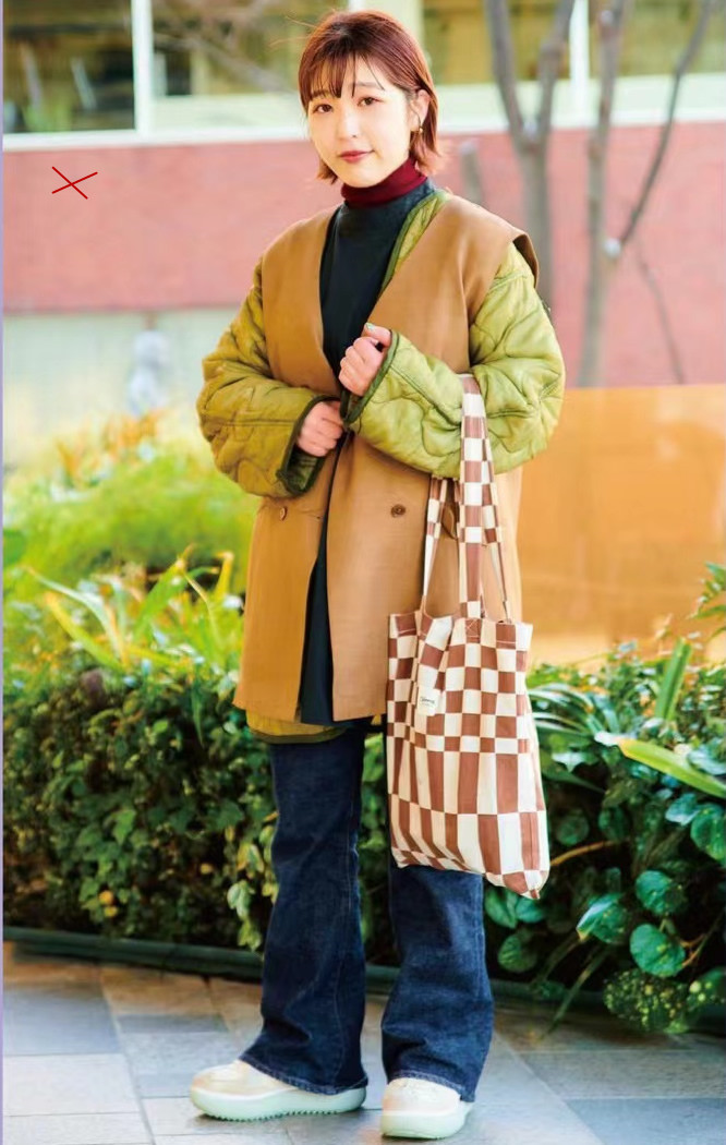 下圖中,馬甲與H形外套的疊穿,加重著膨脹感,搭配又長又寬的半裙和黑色厚底靴,沒有精緻收縮調節,看上去拖拉、顯矮、顯胖。