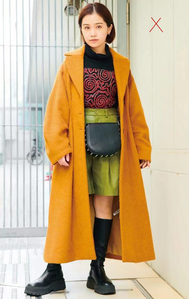 如下圖,南瓜色大衣、紅黑圖案、果綠色短褲、黑色長靴,生硬拼湊組合,不知想表達什麼,也不懂為什麼要強行配伍。