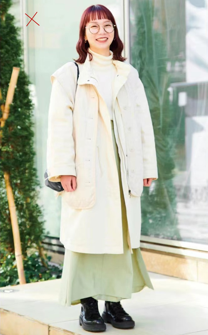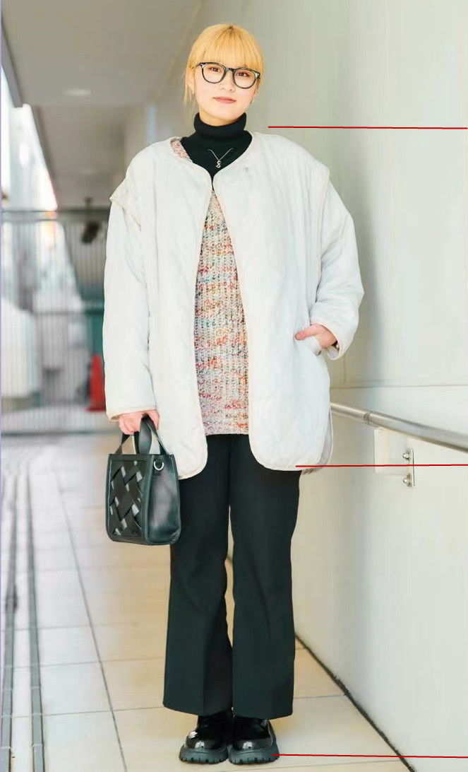 下圖中,白外套與黑褲、黑鞋,以及內搭黑色高領衫,硬生生將整個身材截成三段,顯得腿短個矮,影響縱向顯瘦顯高比例。