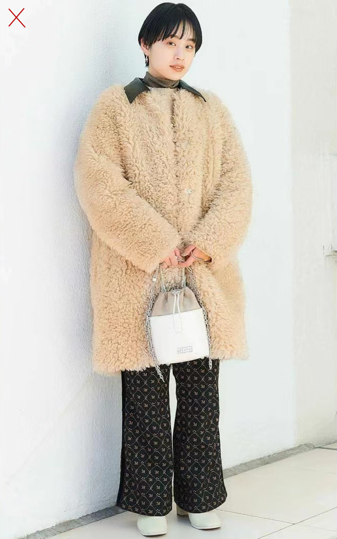 寬+寬、亂+亂、長+長,影響縱向顯高顯瘦線條的終極殺手!從上至下,像一個移動的長方筒,生硬呆板,沉重顯矮。