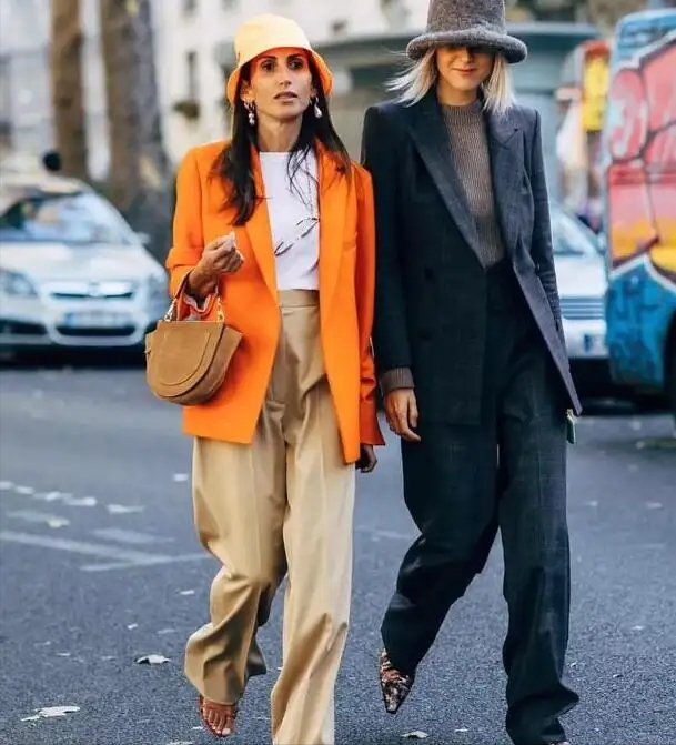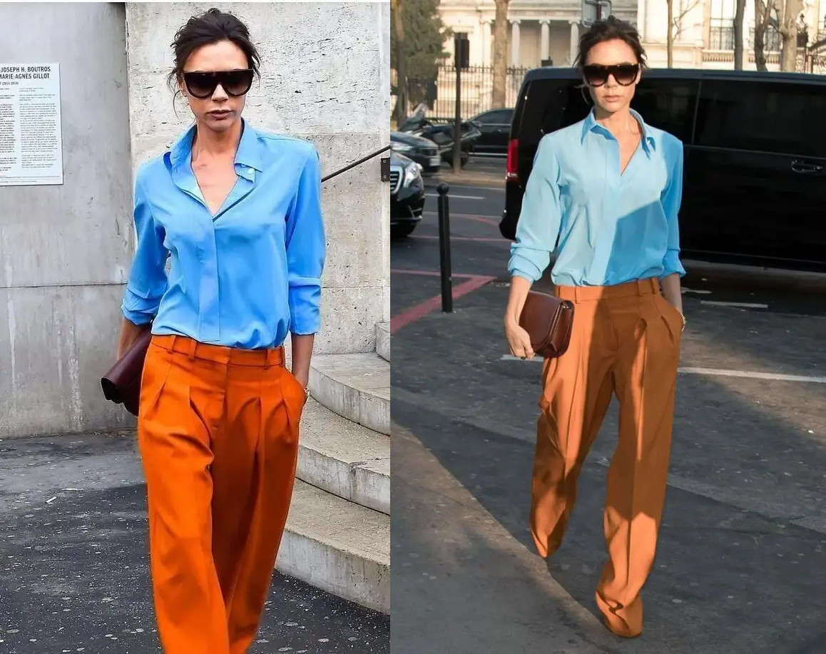 藍色襯衫搭配橙色長褲,當降低飽和度後,高級感蹭蹭提升。雖從冷暖配色出發,無可挑剔,但想要顯得更大氣時,控制鮮艷度即是分寸標尺。