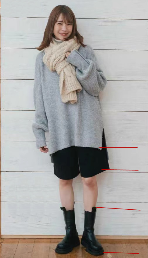 寬大毛衣下,下半身比例一言難盡。加一雙黑色長襪,會不會好很多?