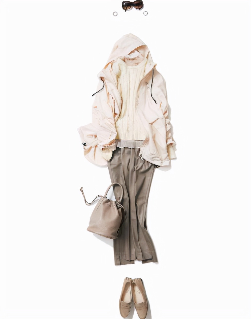 嫌黑色太沉重?與外套同色的淺米色同色系是優選。與上面黑色的區別是,拉大內搭針織衫與褲子的深淺差異,打造對比分明的層次差異。