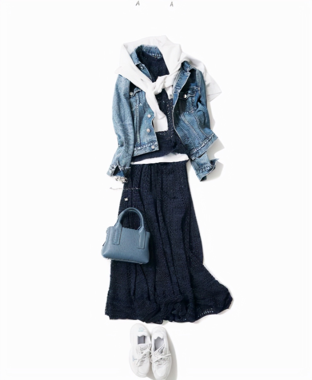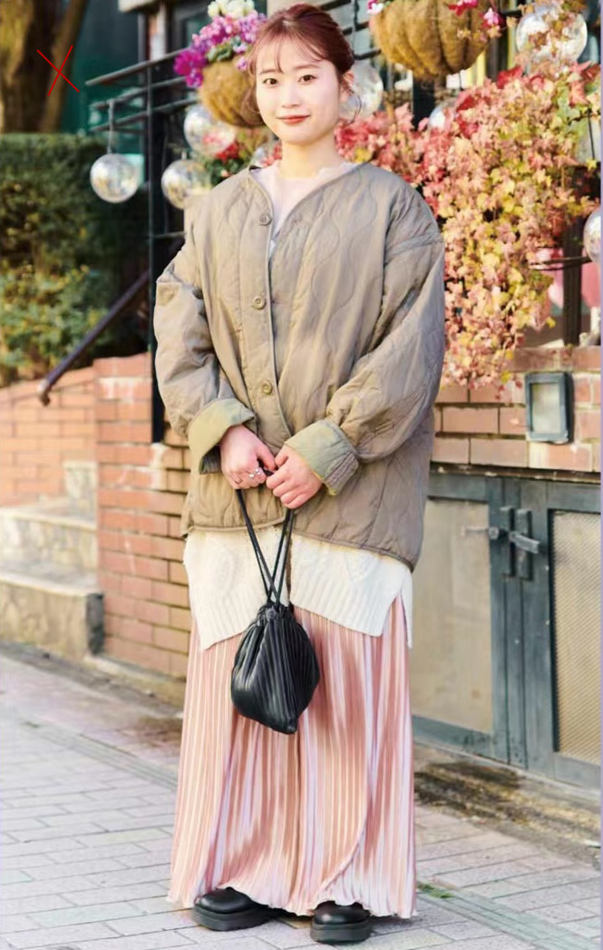 這套搭配,本意想憑借材質差異取勝,卻沒控制好厚重與輕盈之間的層次關係。再加上內搭毛衣的突兀、半裙過長、鞋子厚重,沒有可取之處。
