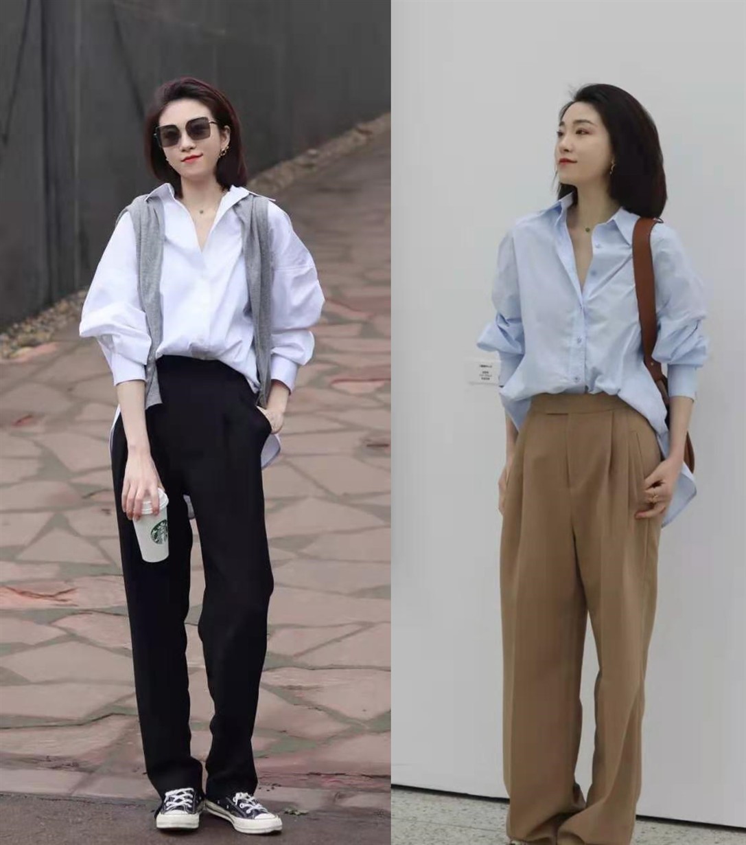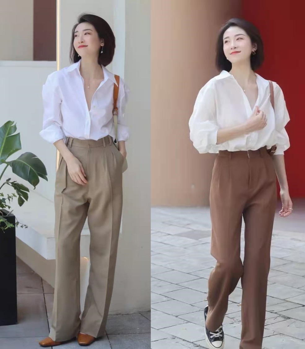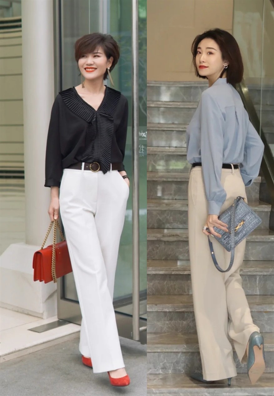 只是,相比於「襯衫+闊腿褲」的正式休閒感、簡約大方感,我更喜歡「襯衫+闊腿褲」的精緻優雅美,如同下面兩位時尚博主的穿搭效果,把優雅氣質滲到骨子裡,妥妥的女神范。