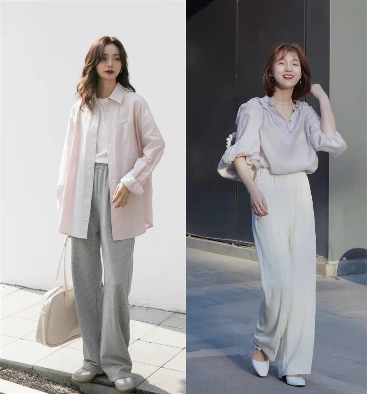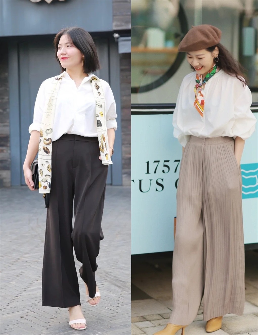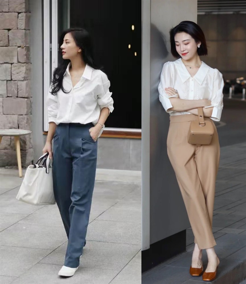 只是,相比於「襯衫+闊腿褲」的正式休閒感、簡約大方感,我更喜歡「襯衫+闊腿褲」的精緻優雅美,如同下面兩位時尚博主的穿搭效果,把優雅氣質滲到骨子裡,妥妥的女神范。