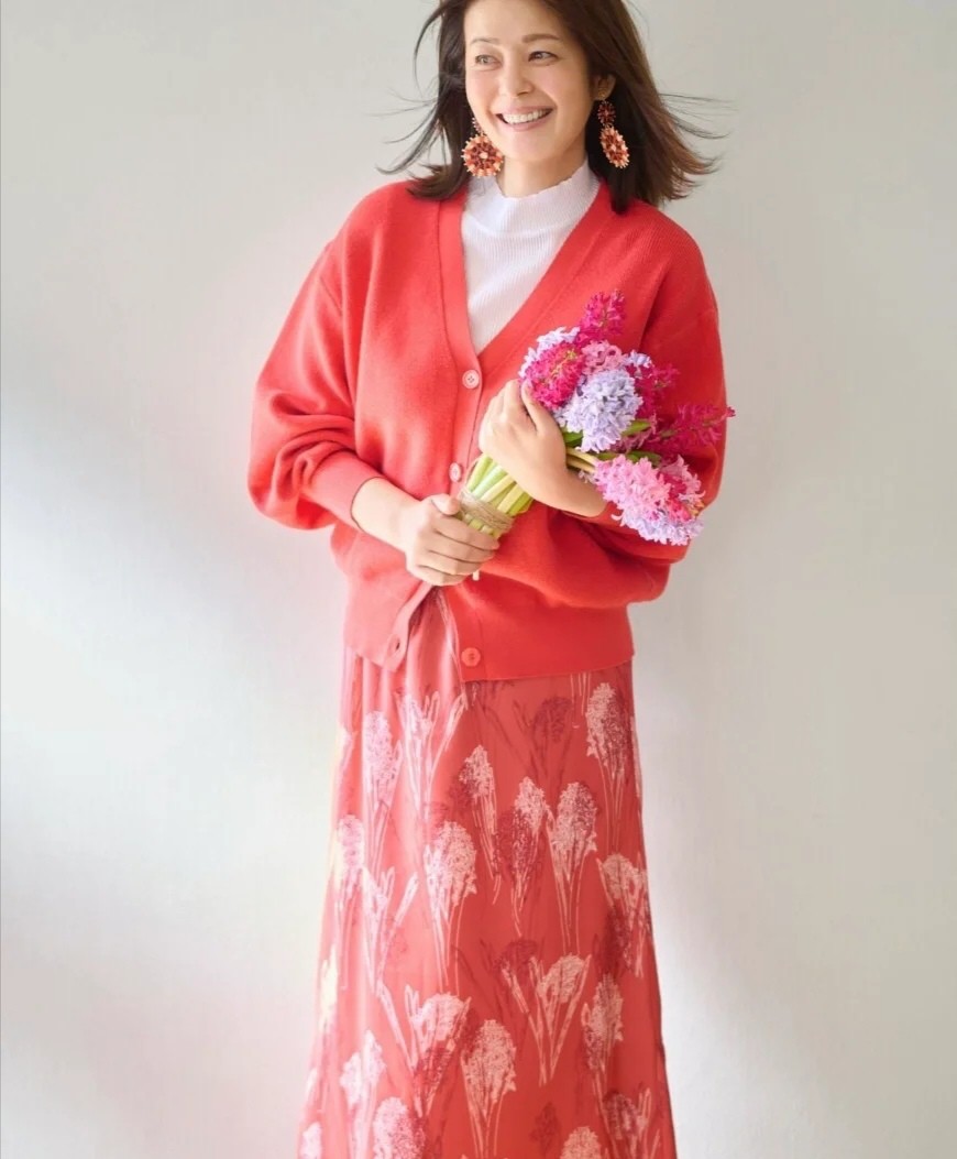 想要增加挑戰難度,可以選用這款桃紅色的開衫,採取同色系的半身裙配合,讓色系形成高度的統一。裙裝演繹時髦感,耐看又高級。