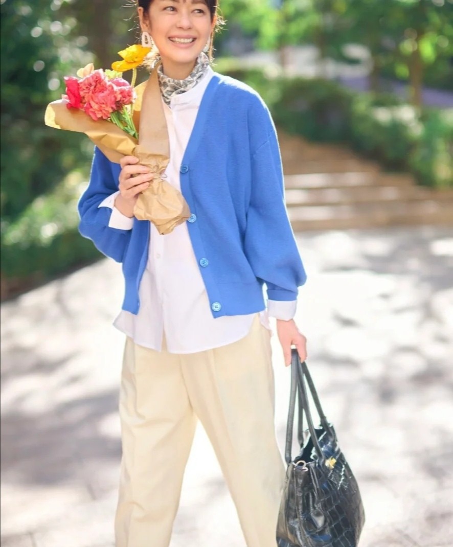 三木媽媽採取的是藍色針織背心和開衫的配合,而內搭的背心修身,可以透露出玲瓏的曲線,外套的針織衫則較為寬大,這是為了塑造出慵懶的風格,整體著裝十分愜意,搭配寬大又隨性的闊腿長褲,也很有時髦感。
