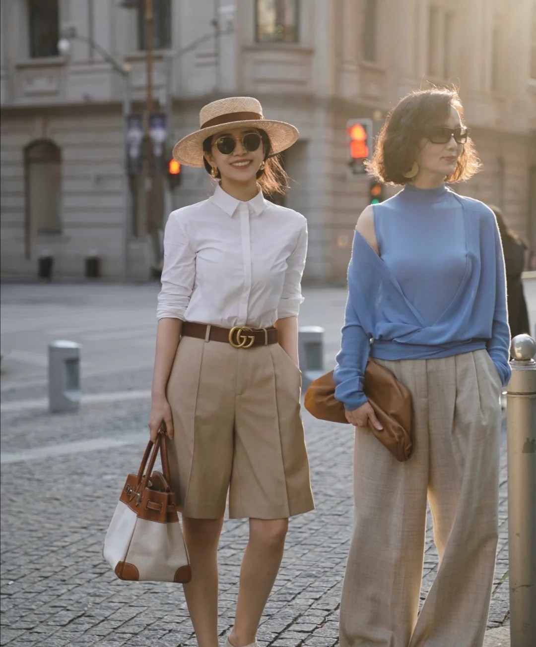 例如三木媽媽身上的這款小西裝,它能襯托出好氣質,將肩膀修飾得更筆挺,把腰部修飾得更緊實,顏色也很有親和力,可以打造出大方的形象。追求高辨識度的女士,可以在裡面疊加一款彩色內搭。下半身結合的則是寬大的短褲,這是另一種更新潮的「緊+寬」搭配法。