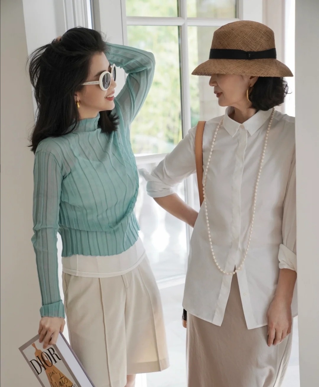五十九歲的三木媽媽,絕對是行走中的穿搭教科書,她採用的服裝材質柔軟,款式較窄小,但絕對不會顯得太緊繃,搭配寬鬆的闊腿長褲,舒適又休閒,簡單又藏肉。