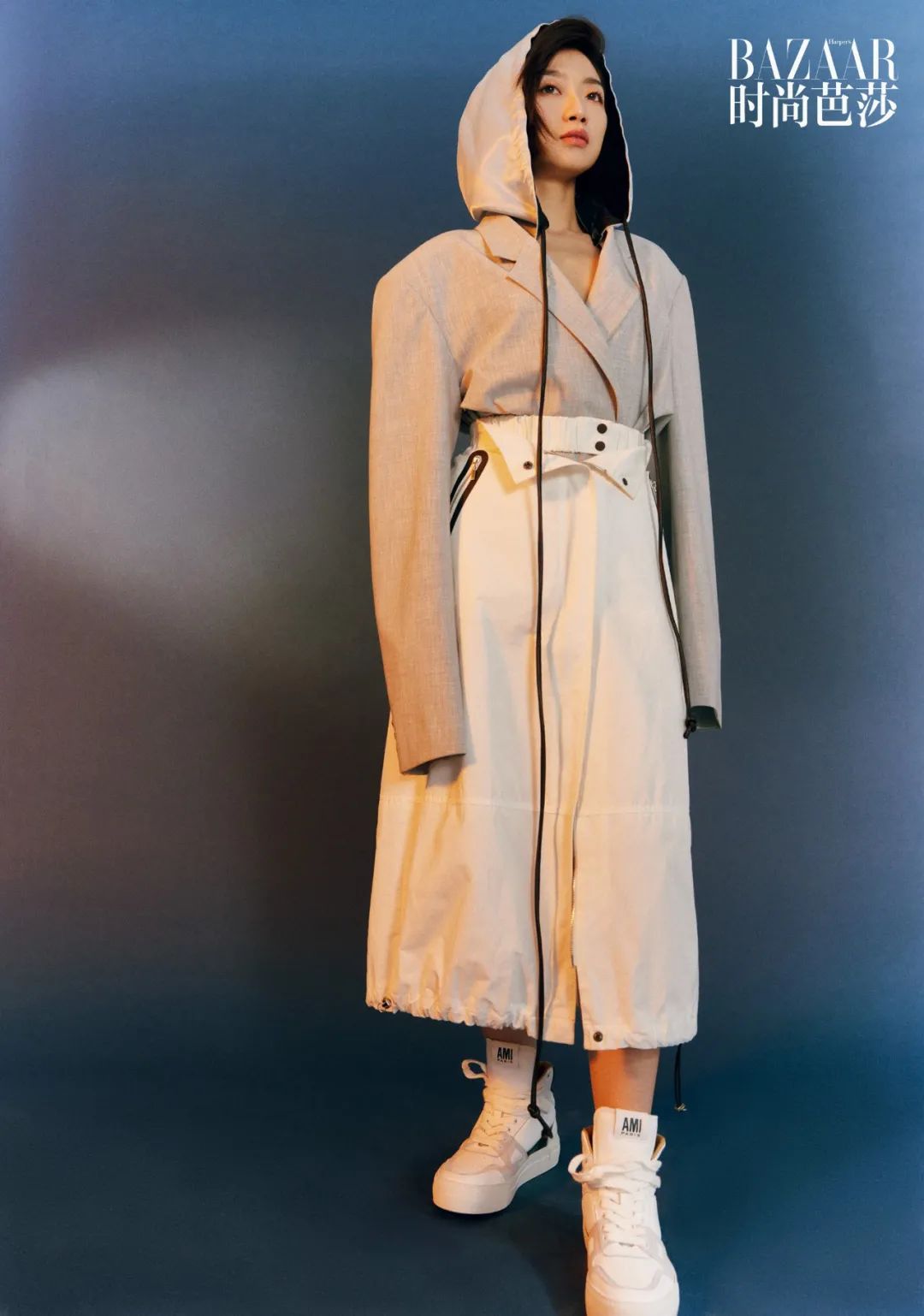 西裝連帽上衣、半裙均來自YOEYYOU