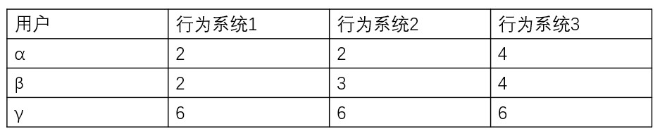 其實最早這個算法是用在推薦商品上的,一開始就叫「買過A商品的人也喜歡B」這樣的一個推薦。然後我們將用戶的一些行為與數據進行建模打分,放到一個多維向量坐標裡(這裡假設一個三維坐標系好了)。我們假設有三個用戶α、β、γ,然後他們分別有三個行為系統,服務器搜集了他們的一些行為之後,對他們的偏好打分,並且分別放到三個行為系統的向量裡。