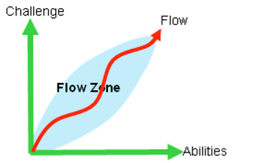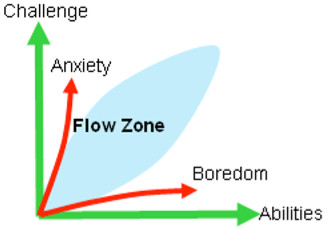 上圖就是心流通道,當技能高於挑戰的時候,離開心流通道的區域被認為是「無聊的」,當挑戰高於技能時,離開心流通道的區域被認為是「焦慮的」。