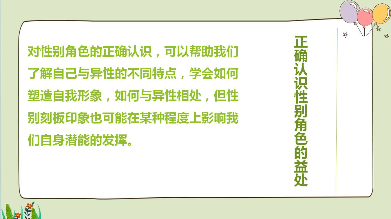 對性別角色的正確認識,可以幫助我們了解自己與異性的不同特點,學會如何塑造自我形象,如何與異性相處,但性別刻板印象也可能在某種程度上影響我們自身潛能的發揮。