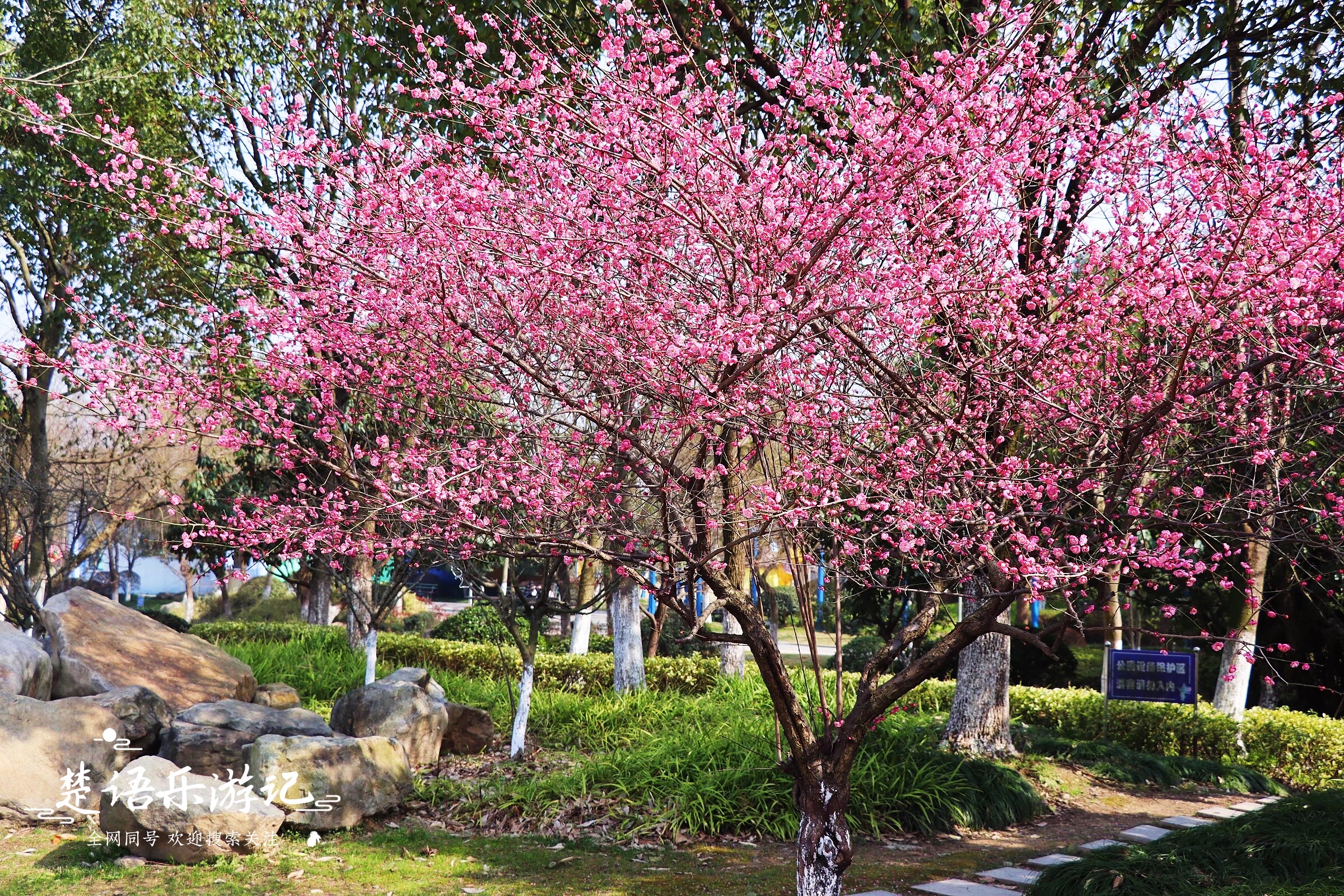 公園的西北角靠近河畔有幾棵梅樹,很遠就能看見滿樹艷紅的梅花。這裡算是一個小型賞梅地,雖然只有幾株梅樹,可是枝繁花密,旁邊有亂石,樹下有小徑,站在梅花下拍照也很出片。整個黃山兒童公園裡,像這樣的梅林還有幾處,每一處都是一個小風景,算不上特別美麗,但是各有風情。