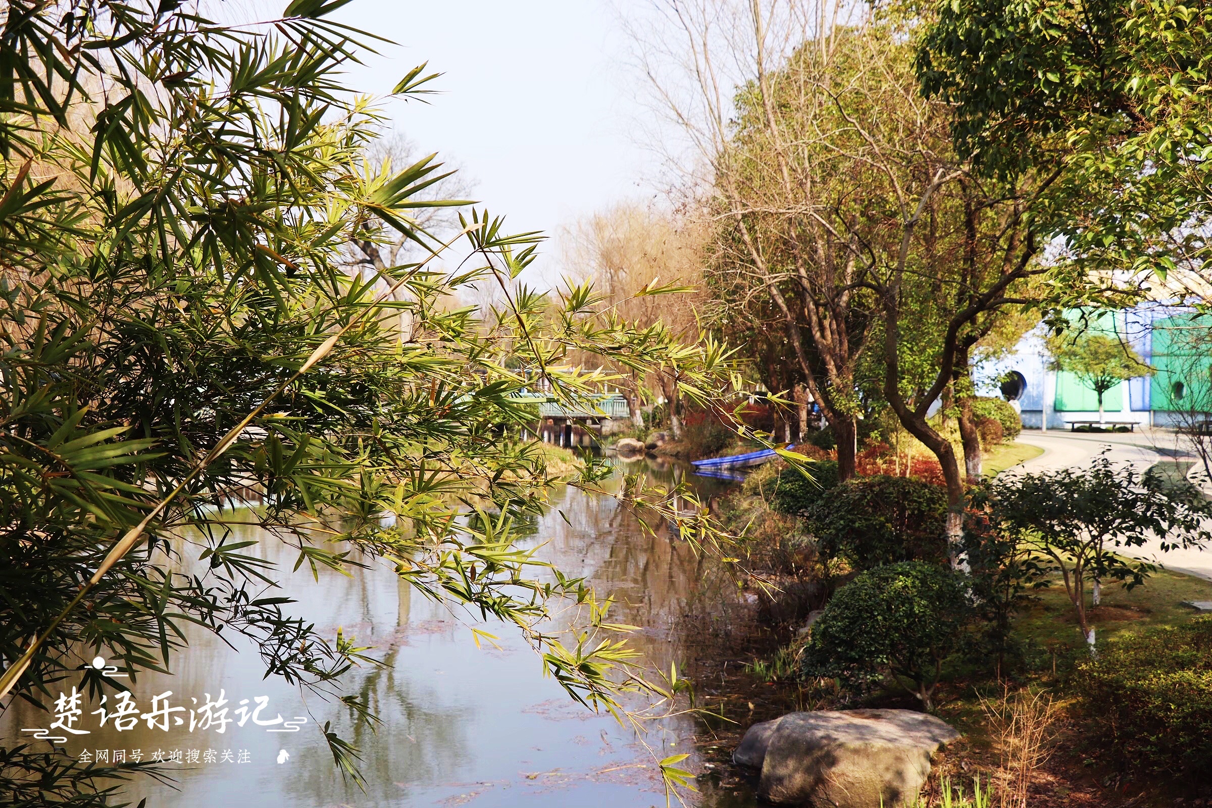 公園的西面是河道交匯處,寬闊的水面中間有一座小島,島上遍植樹木,形成一片「森林」。一條木質曲橋從林中穿過,兩端各有一座石橋,分別連接著開豐路和兒童公園。靠近水邊有兩排水杉,現在只剩下光禿禿的樹幹,如果在秋冬時節,這裡的風光應該很美麗。
