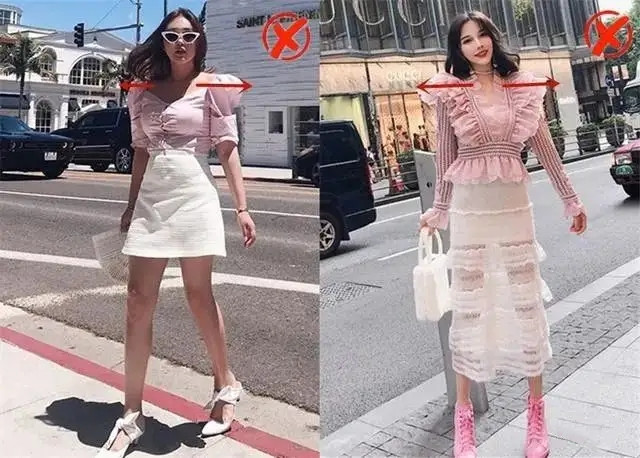 既然明確了身材的缺點,就需要盡量去避免和弱化它,對於肩寬的草莓身材來說,就需要盡量避免各種墊肩、泡泡袖、一字肩等款式的服飾,不然很容加重肩膀的存在感,更顯得雄壯。