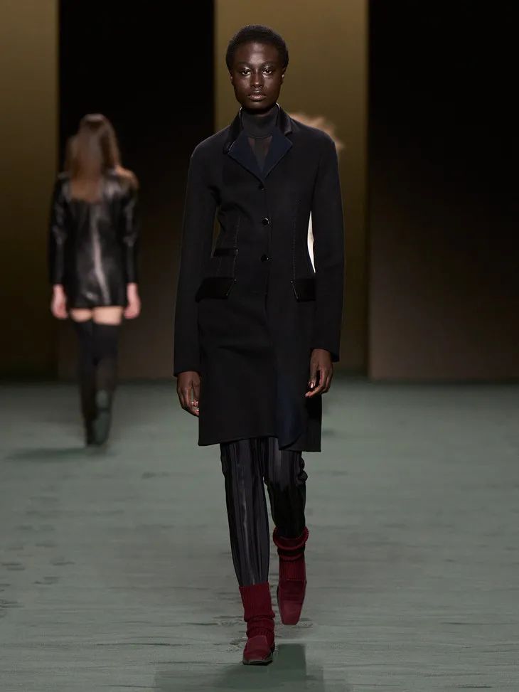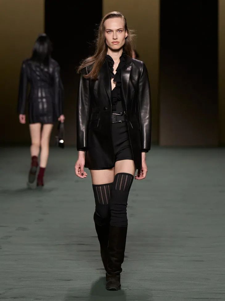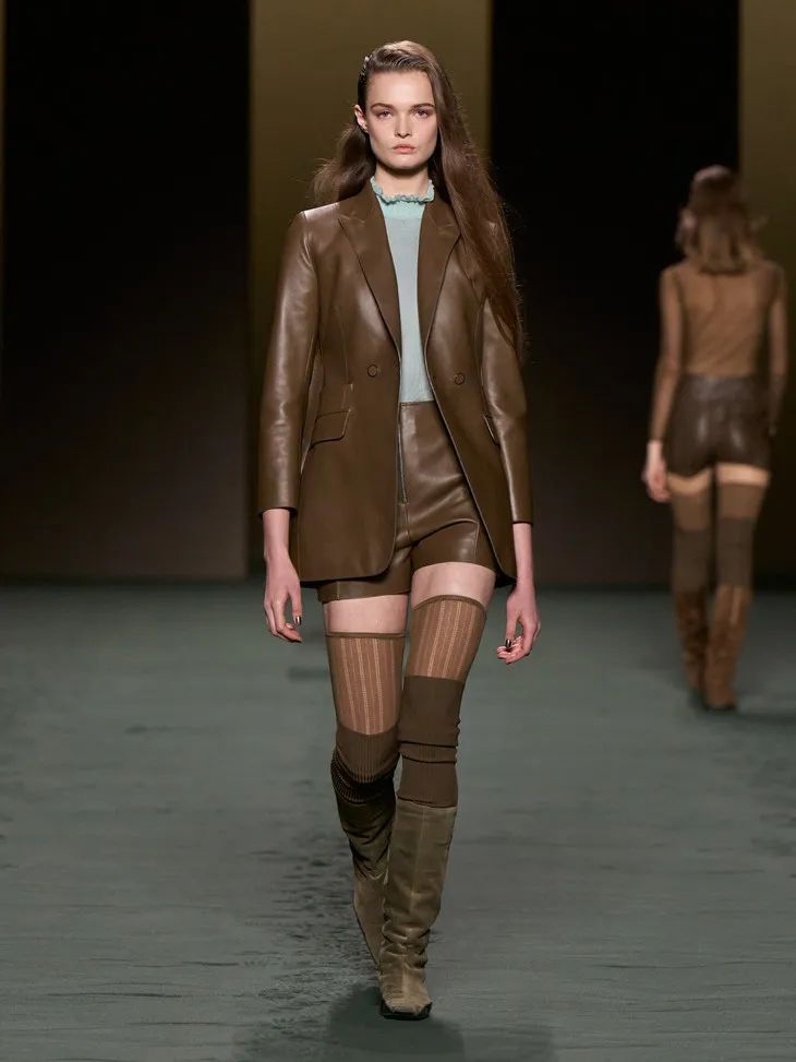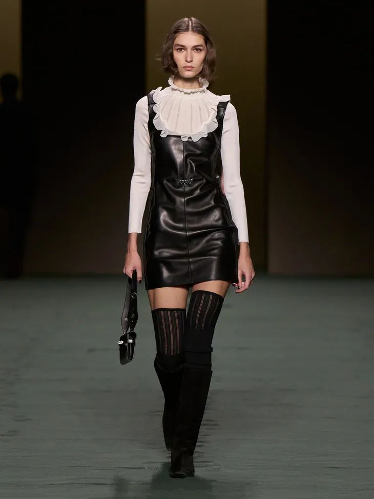 這些披在透明膚感單品外的皮質時裝就是最好的證明,一絲不茍利落的剪裁,順滑的面料,為性感披上了不容侵犯的鎧甲。證明了服裝不只是向大家傳遞了設計,還傳遞了關於美的多樣性和包容性。