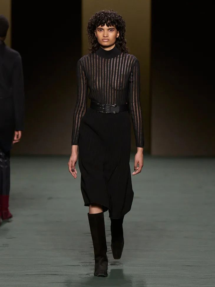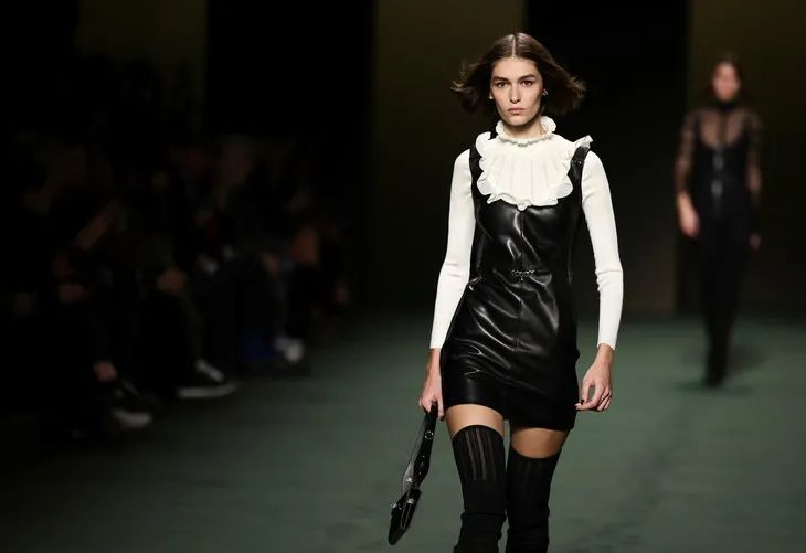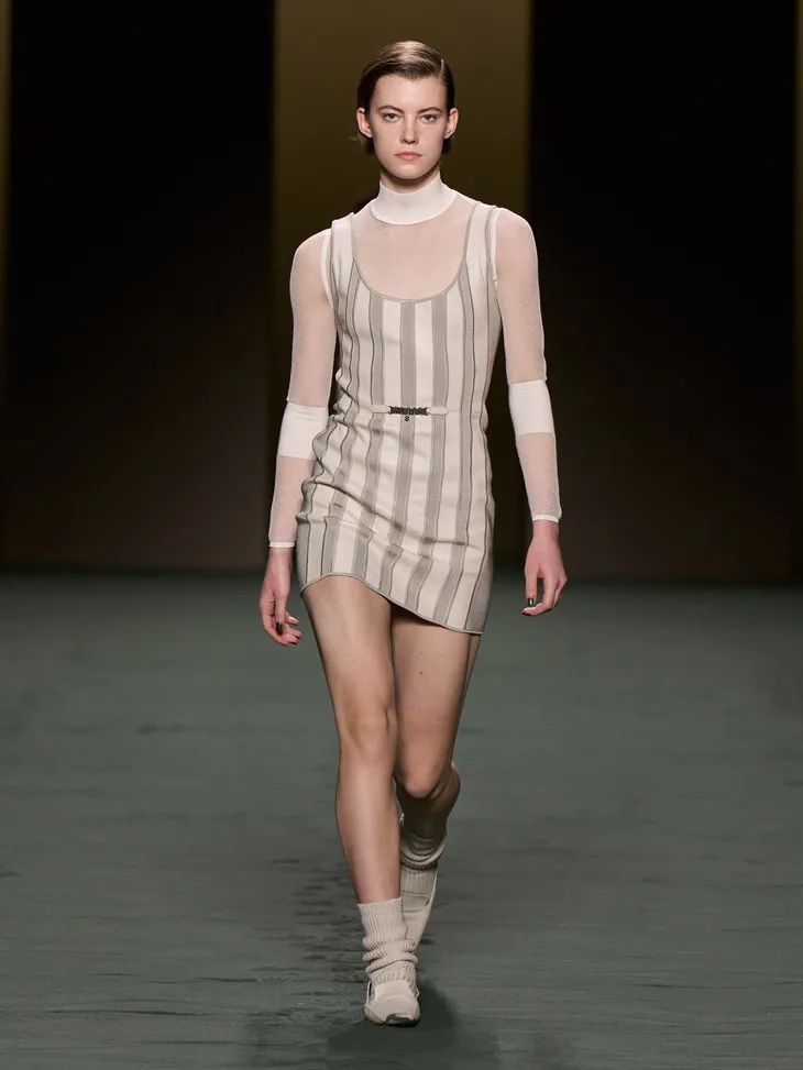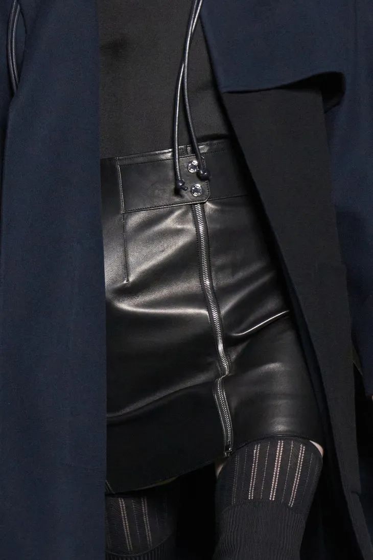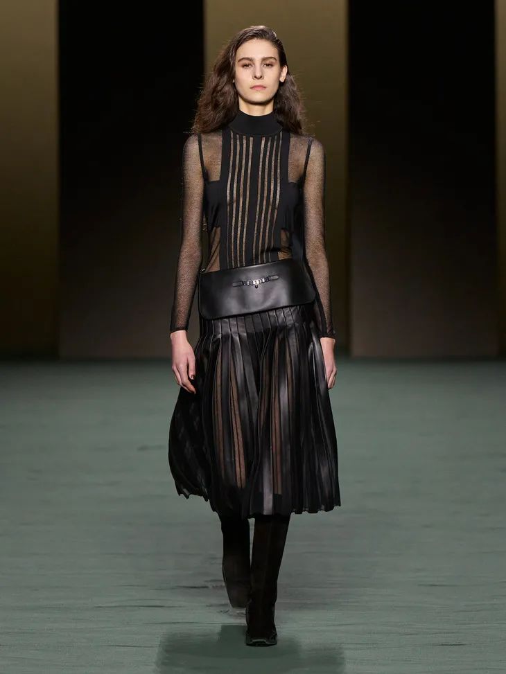 這些披在透明膚感單品外的皮質時裝就是最好的證明,一絲不茍利落的剪裁,順滑的面料,為性感披上了不容侵犯的鎧甲。證明了服裝不只是向大家傳遞了設計,還傳遞了關於美的多樣性和包容性。