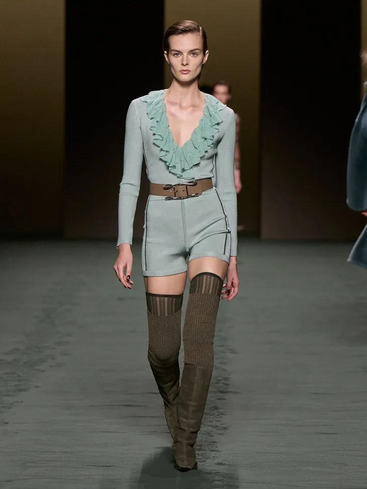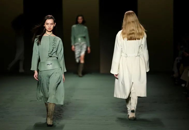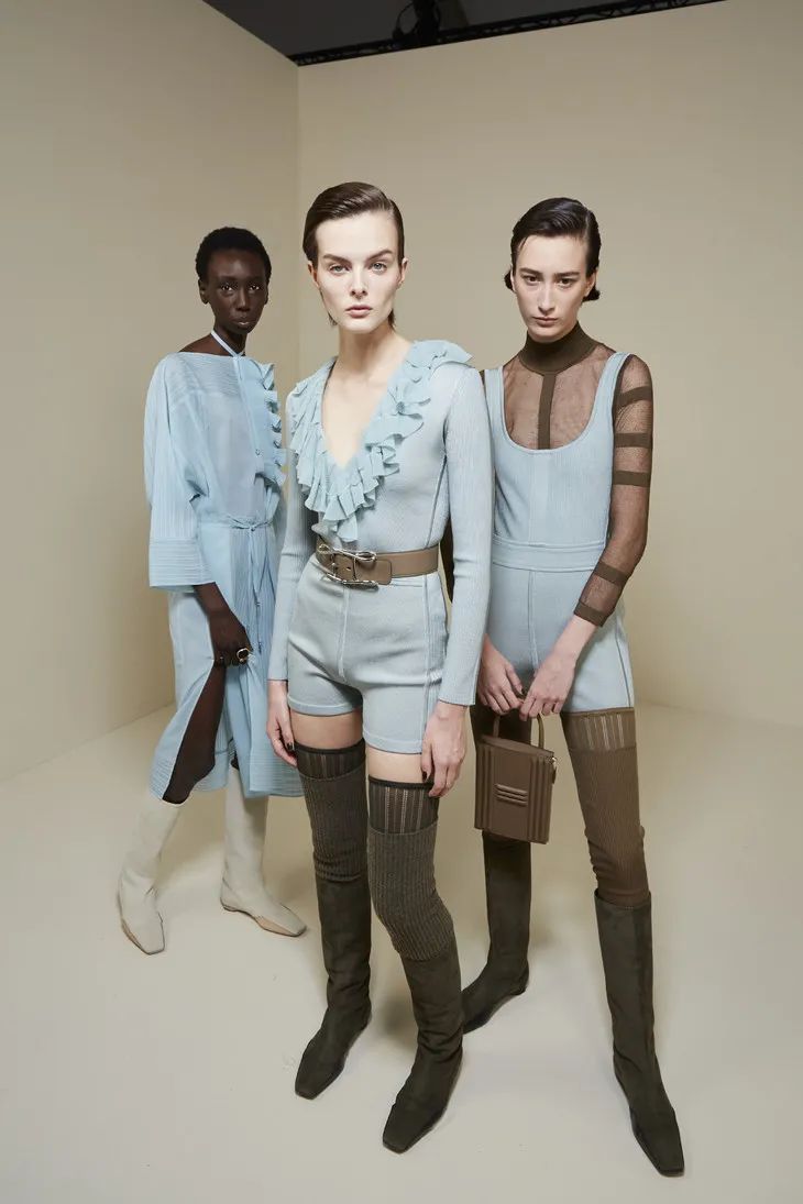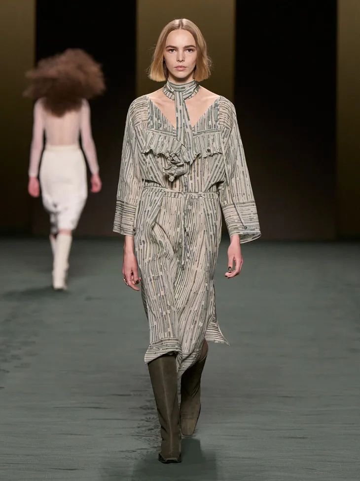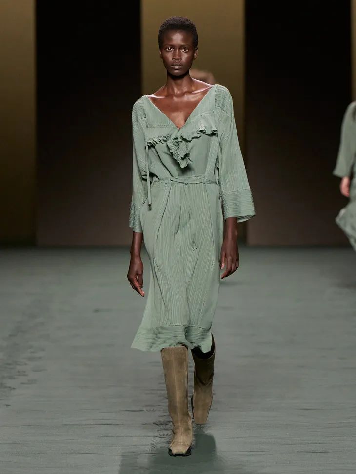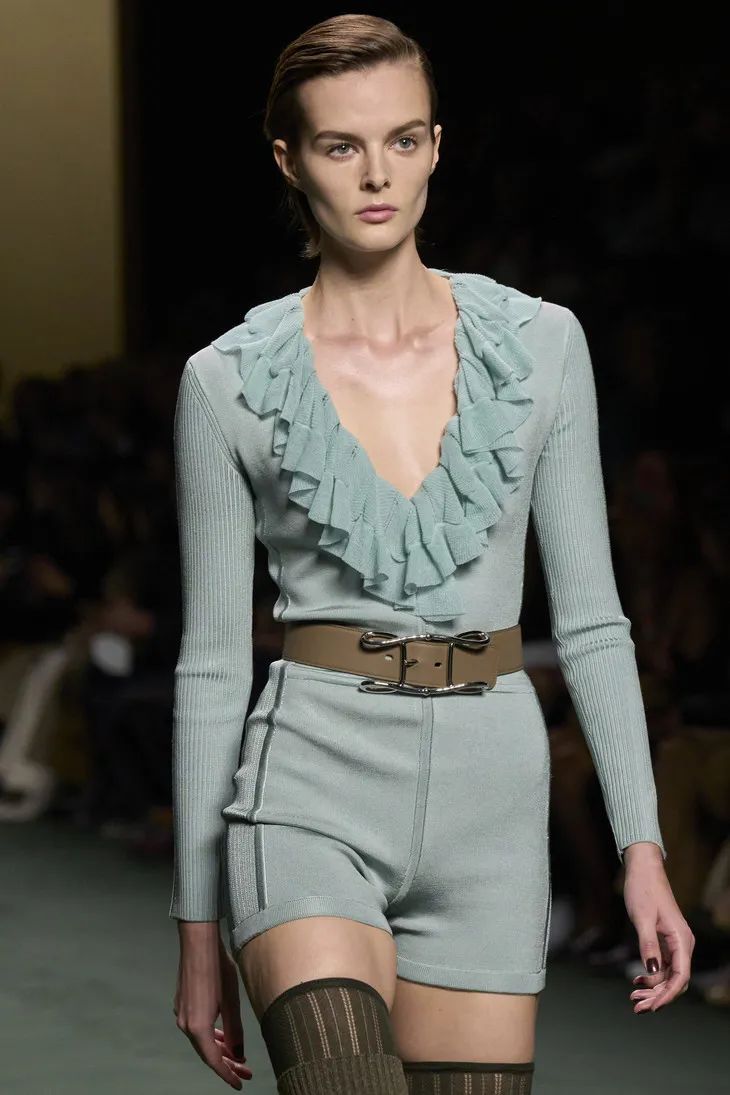 鼠尾草綠、苔蘚藍點、陶瓷藍色、灰綠色點亮了這一季的T臺,自然的色系低調中流露出女性柔美的氣質。點綴上荷葉邊、蕾絲、透視條紋……輕盈的面料隨著模特的走動,仿佛是靜謐中的片刻喧鬧,是美好的燦爛。
