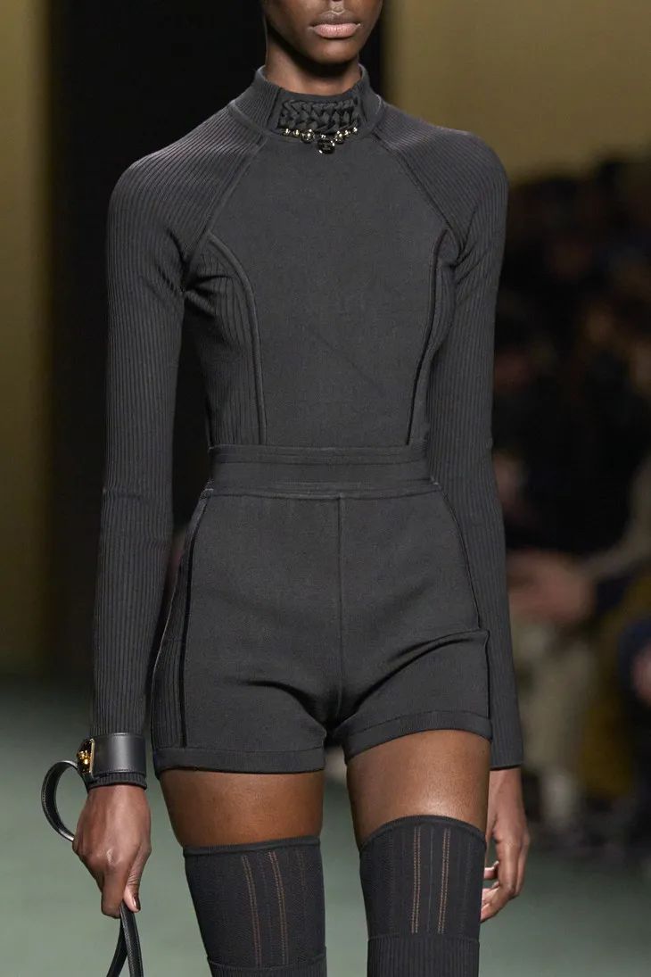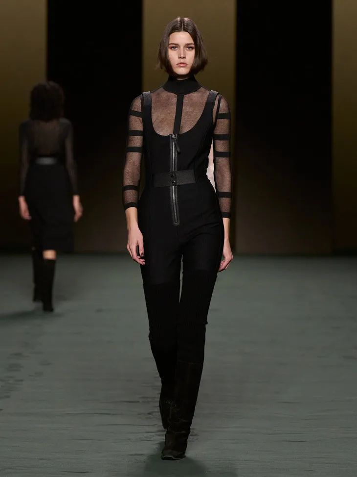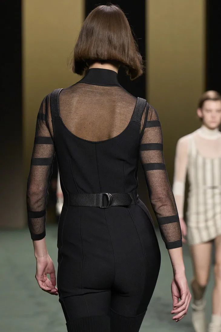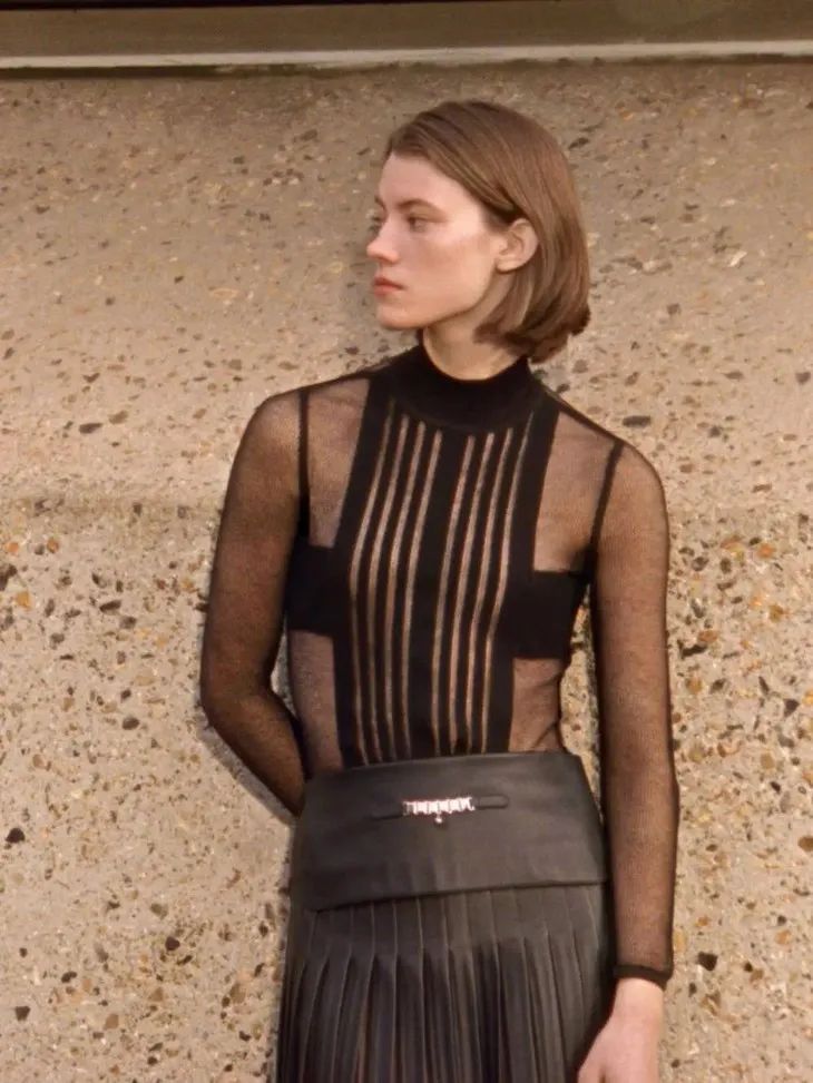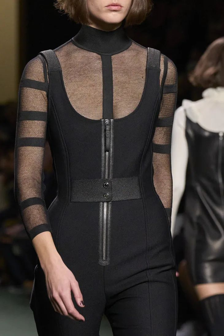 大膽的透明膚感單品在此系列中多次出現,針織衫、連體衣、貼身迷你裙等透視服裝,充滿誘惑力。但同時它又是內斂、不張揚且優雅的。