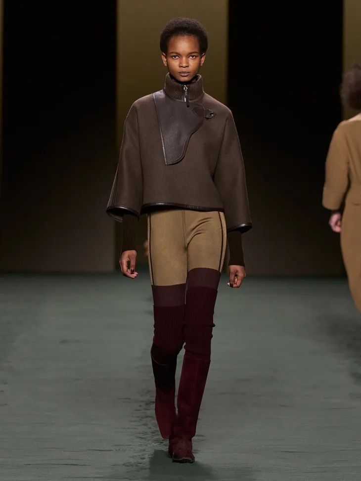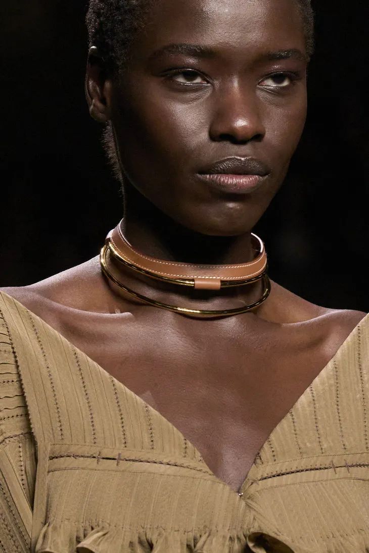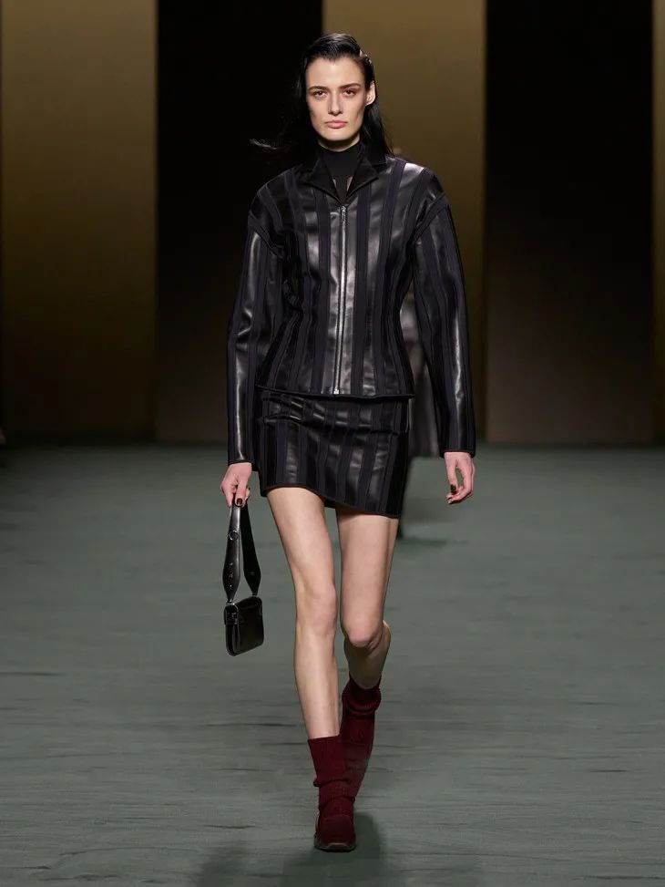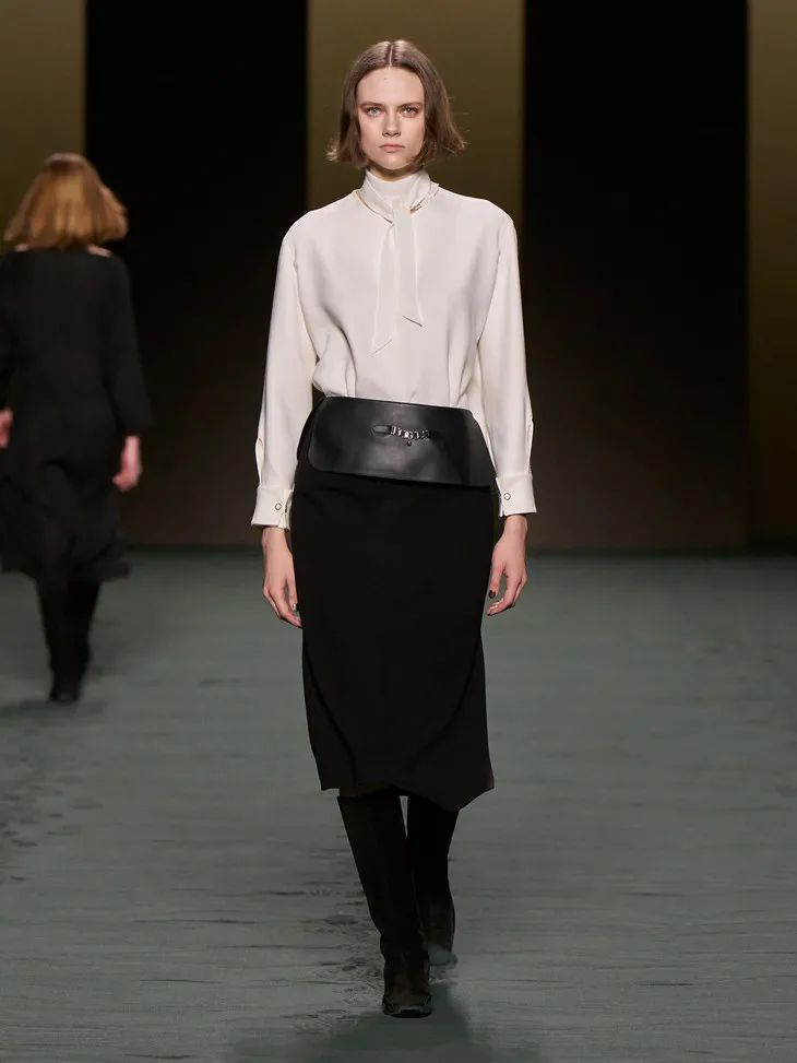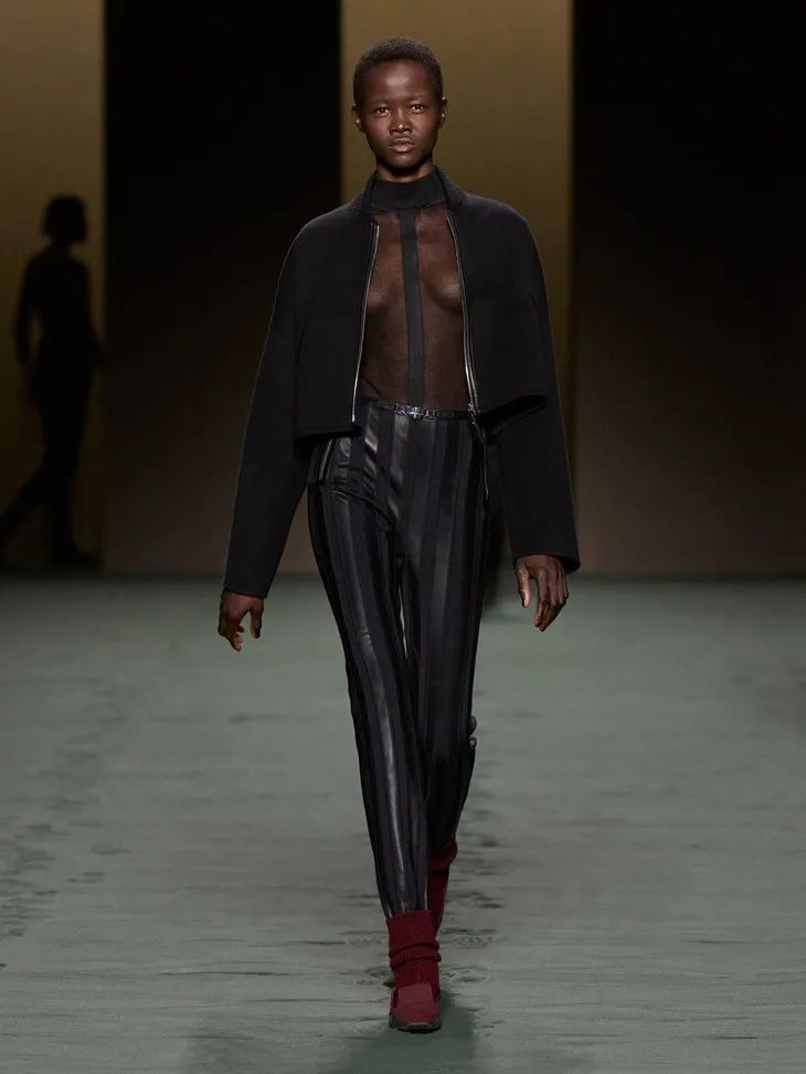 當然Hermès作為善於制皮的品牌,將皮革運用在成衣中也遊刃有餘。整場秀隨處可見各種編織和剪裁利落的皮革元素,「圍裙」式寬大的馬術腰帶、輕甲一般的夾克跳脫且克制,讓人眼前一亮。