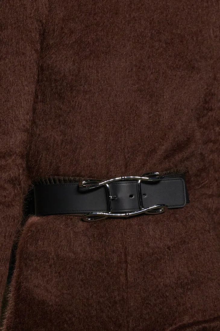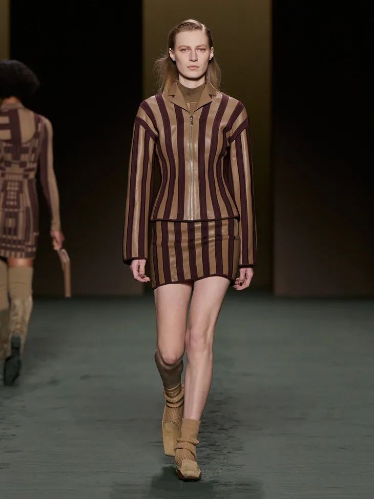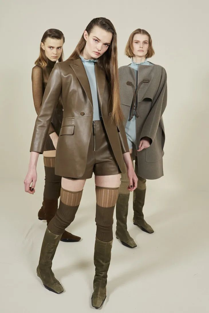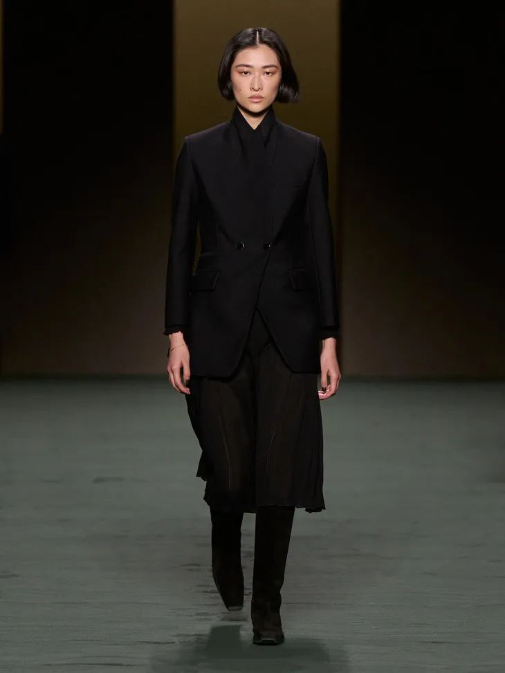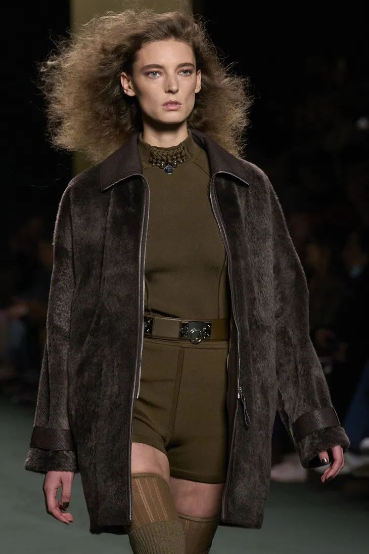 當然Hermès作為善於制皮的品牌,將皮革運用在成衣中也遊刃有餘。整場秀隨處可見各種編織和剪裁利落的皮革元素,「圍裙」式寬大的馬術腰帶、輕甲一般的夾克跳脫且克制,讓人眼前一亮。