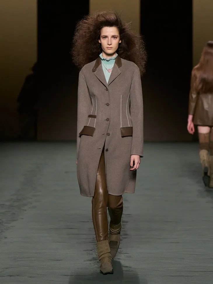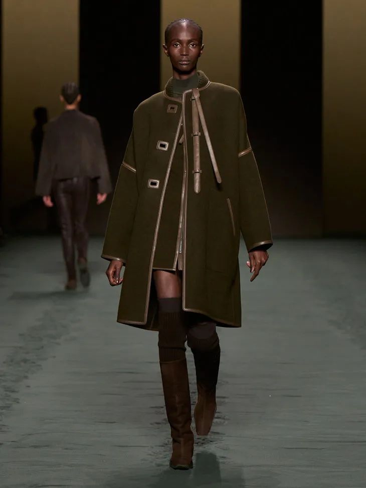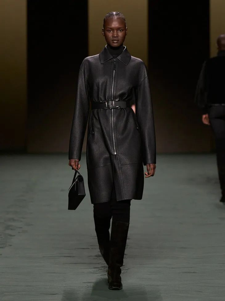 H版型的皮革大衣通過肩部和腰部的特別剪裁,隨著模特走動時與身體恰到好處地貼合、擺動,宛如第二層皮膚,柔美自如,把優雅和瀟灑合二為一。