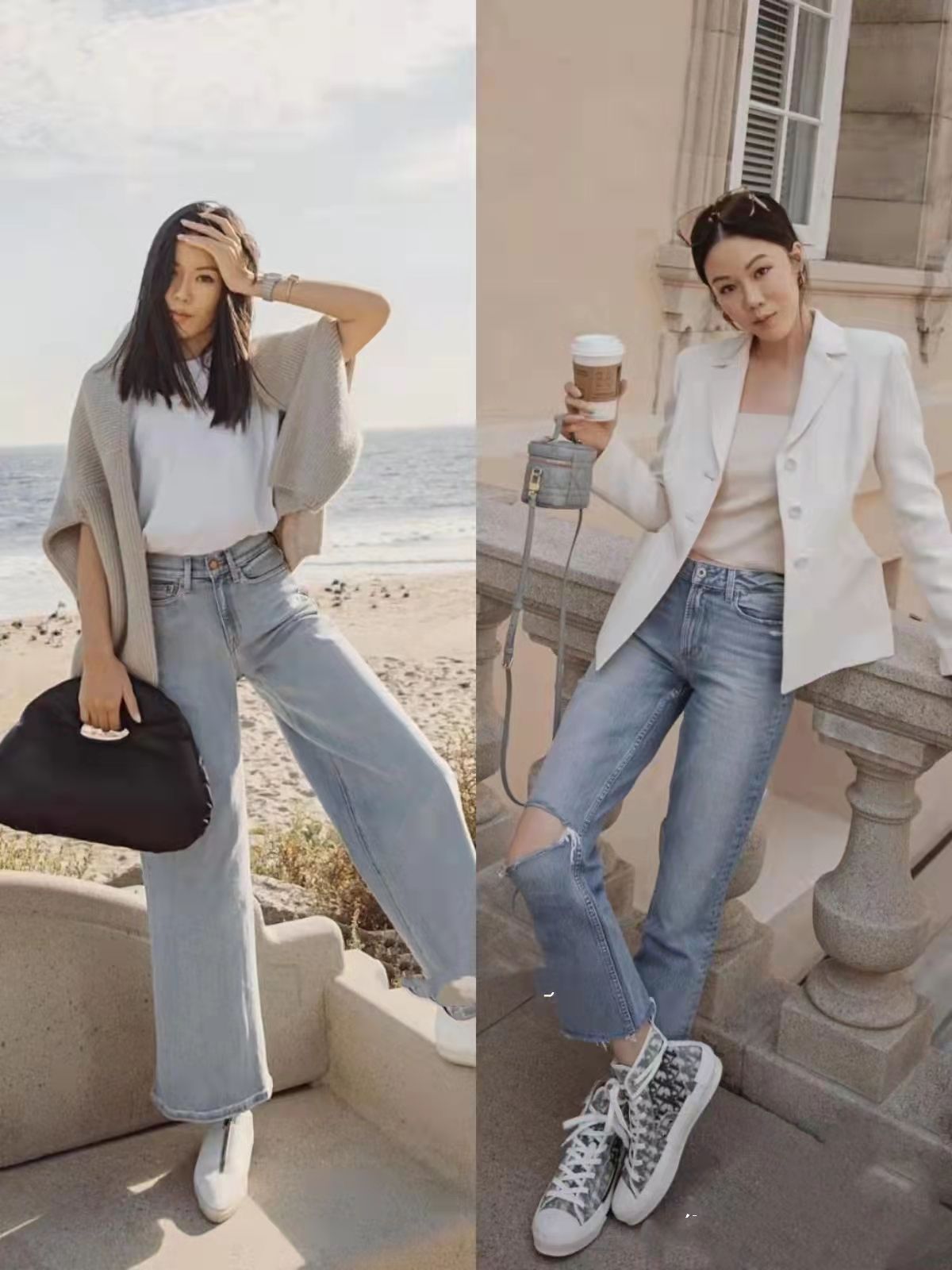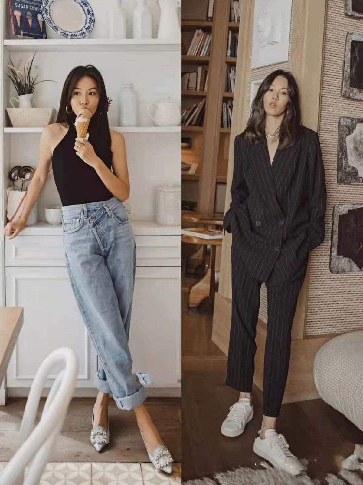 例如非常經典的兩種個性化的穿衣方式,一種是利用短款露臍裝的搭配來呈現出腰肢上的纖細感和曲線感,另外一種就是利用塞衣角的穿衣方式來彰顯出腰線上提的搭配效果,將上衣多餘的衣擺塞進褲子裡面,瞬間就可以穿出高挑感。