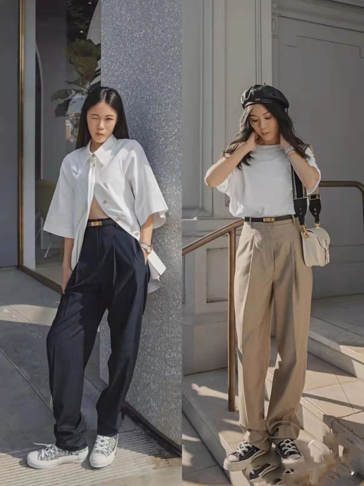 基礎的一身套裝在色彩和款式的設計上都非常簡單和諧,在腰間搭配上基礎的黑色腰帶既可以修飾身形又可以拉高腰線。