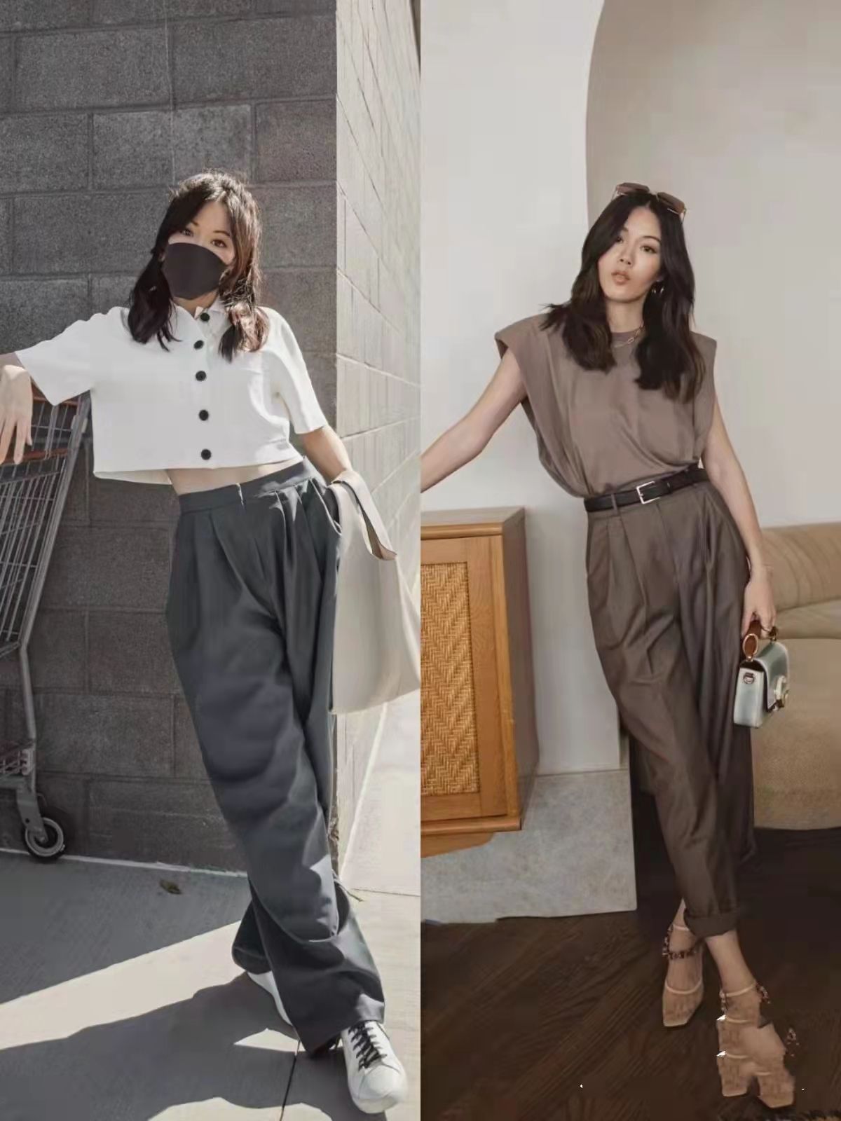 短袖或者是無袖款式的小襯衫搭配上高腰款式的褲子,在上下身搭配上使用上露膚下保守的搭配方式來呈現出一種對比的搭配效果,在清爽感和性感之間很好的掌握了分寸感。