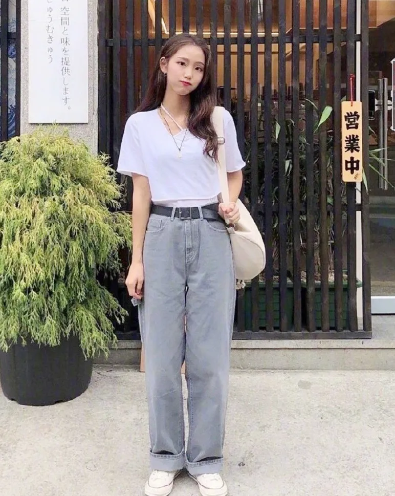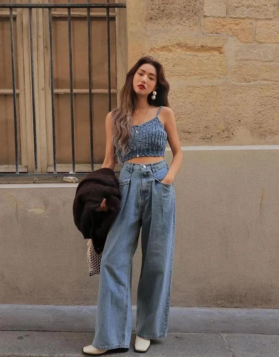 也可以試試這種crop top,露出苗條的腰身,再搭配一條高腰的闊腿褲,1米5也能穿出1米7的身材既視感。