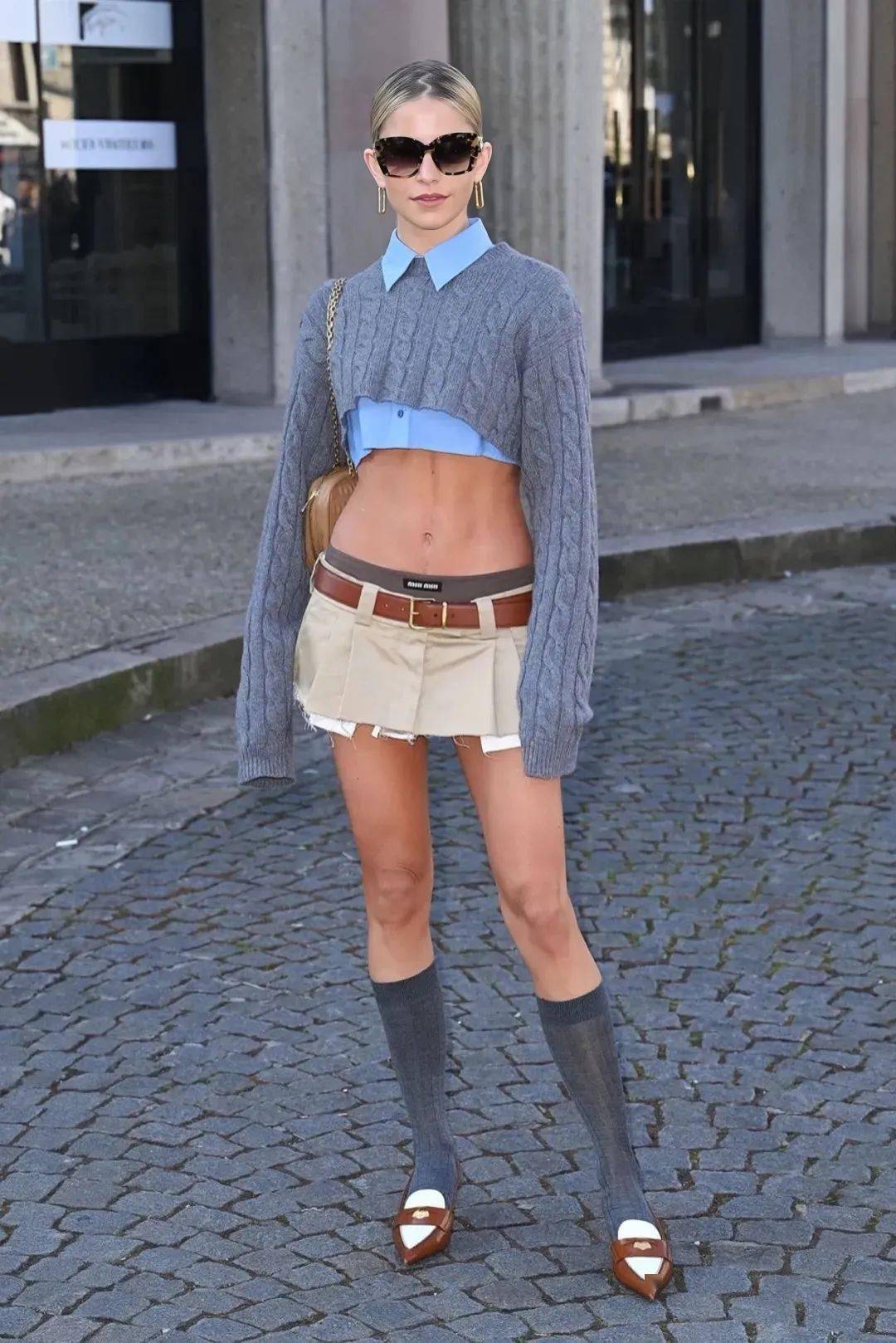 不過,如今的學院風可不再是那麼「乖巧」,短上衣+低腰迷你裙,「炫腹」造型擁有了超搶眼的主角光環。