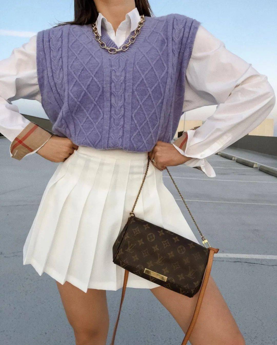 1. 最經典的穿搭公式:襯衫+針織背心+短裙