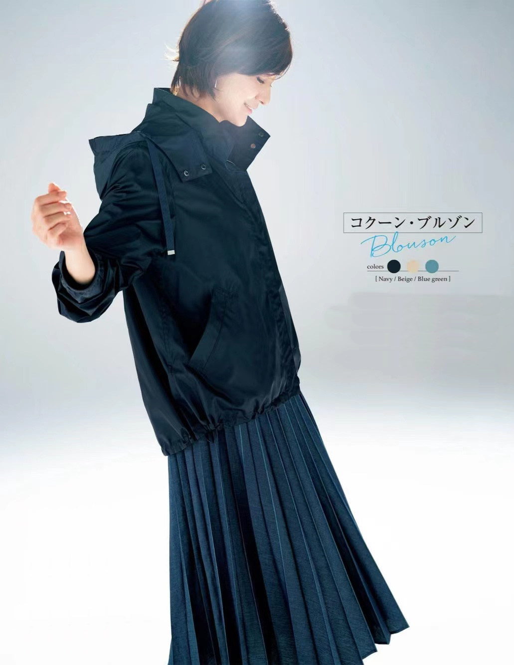 高飽和度的藍色風衣,色調濃鬱、版型利落,非常挑人。幸好,連帽設計的休閒化解,成為精彩手法。與她的氣質不謀而合。
