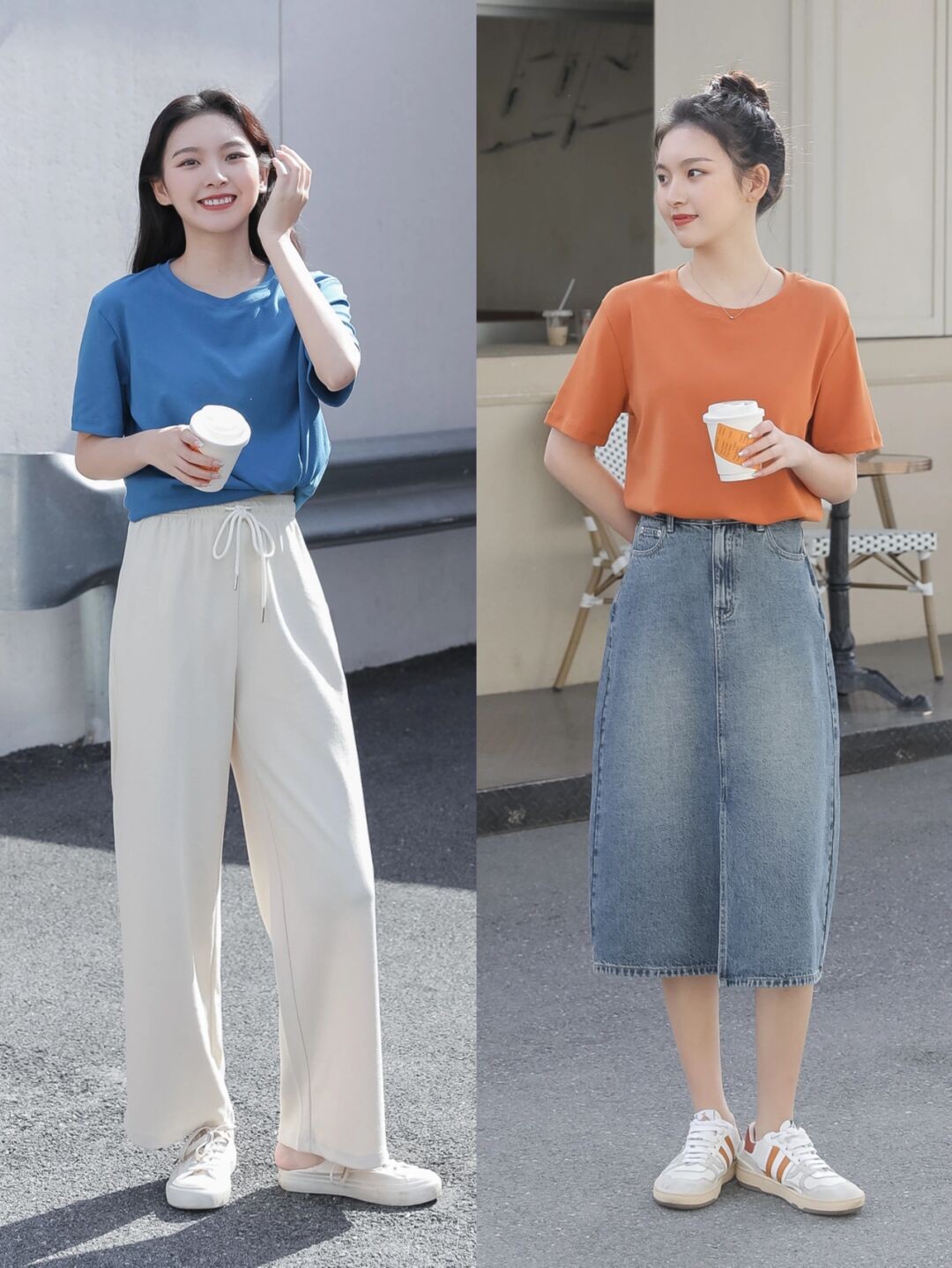 這些搭配就比較簡約,亮色性的t恤搭配上淺色的裙子或者是闊腿褲,簡單時髦,塞衣角的技巧也打造出了小蠻腰。