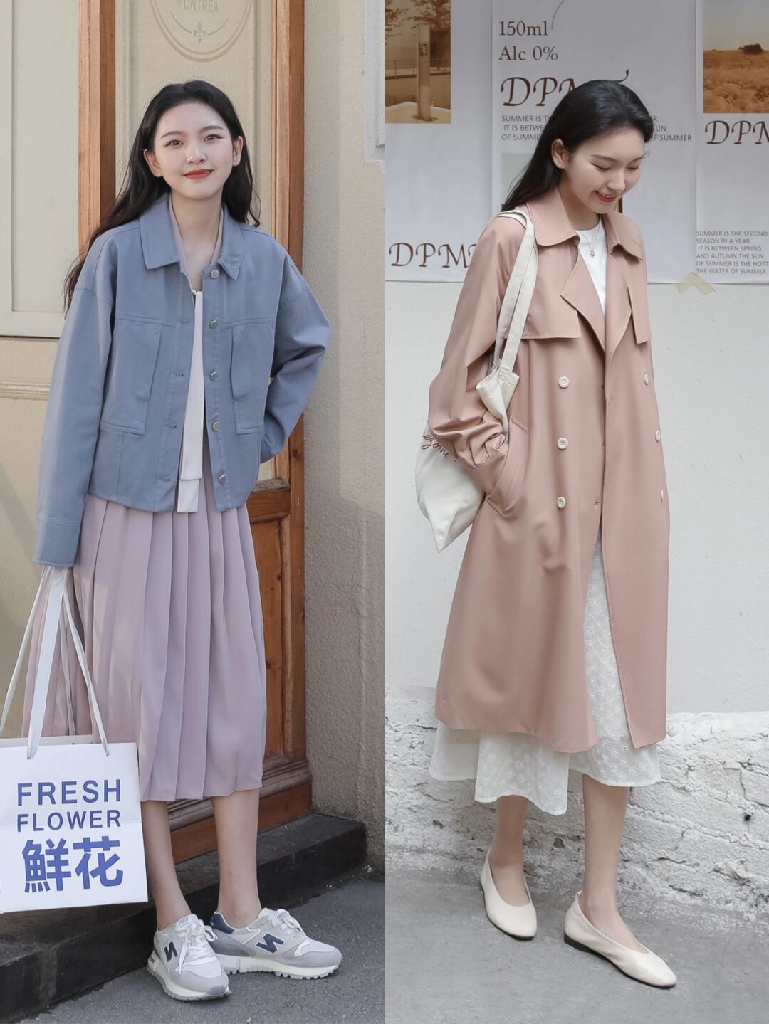 若要選擇外套的話,那麼最好還是要注意一下它的材質不要太厚重,選擇輕薄一些的外套凹造型會顯得更有時髦感。例如藍色外套或粉色風衣,材質看上去都挺輕薄,作為外套疊穿還是挺時尚的,並不會覺得臃腫。