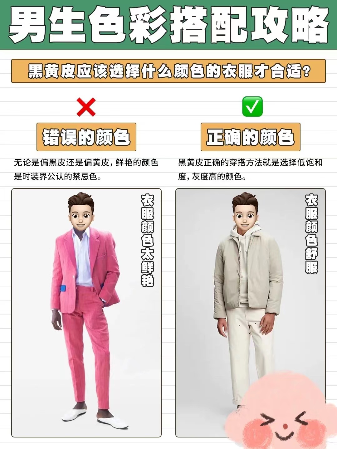 在服裝的搭配中,配色是非常重要的。不管是冷白皮還是暖黃皮,在選擇服裝色彩的時候,都不建議選擇太過鮮艷的顏色。尤其是暖黃皮的人群,還是建議選擇低飽和度,且飽和度相對比較高的顏色。