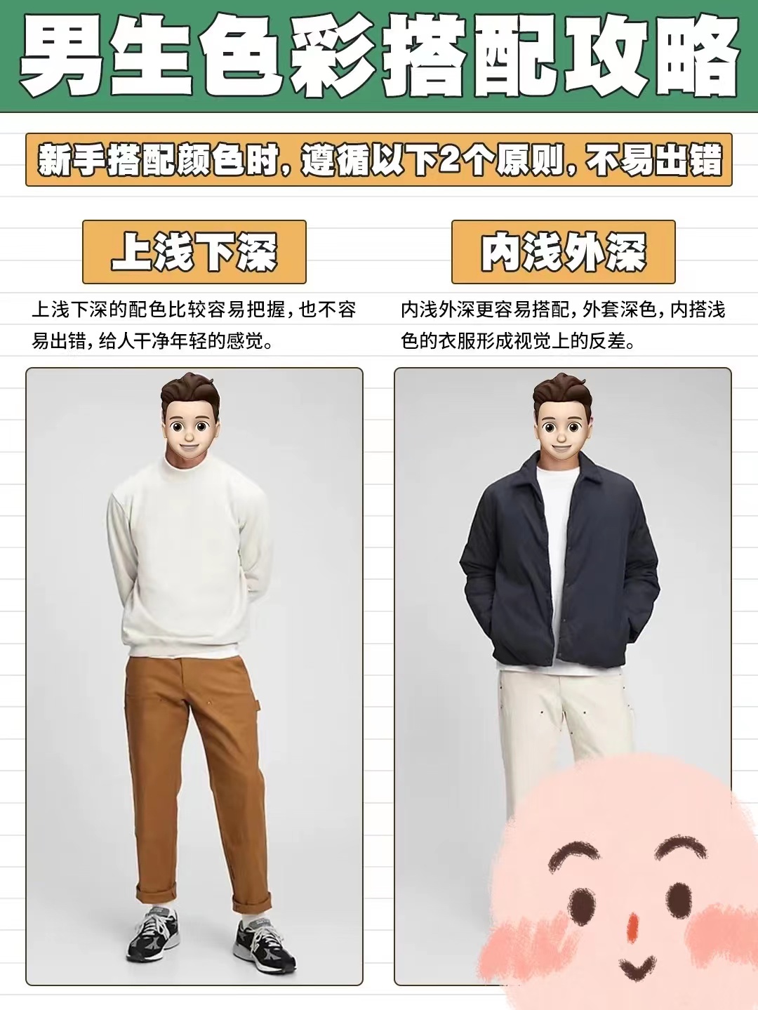 內淺外深的穿搭,在視覺上形成一定的反差,有一種溫和又大氣的美感。也是男士穿搭中,特別常見的搭配技巧。