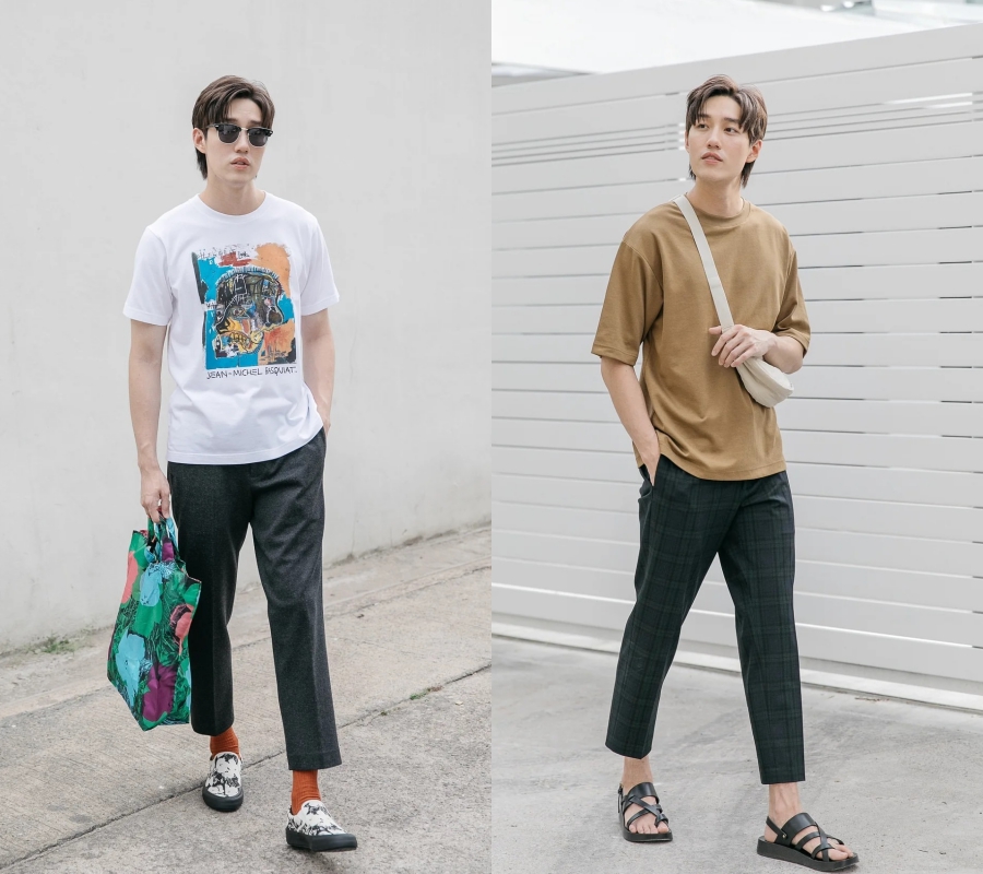 不過,純色的短袖看久了難免會有些無趣,不妨選有圖案的T恤。我的建議是選圖案不太大的,比起右邊的,我更推薦左邊這種小小的。減齡又有趣,有請tor的示范。
