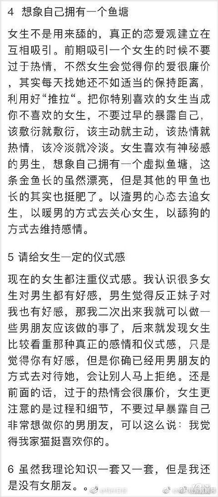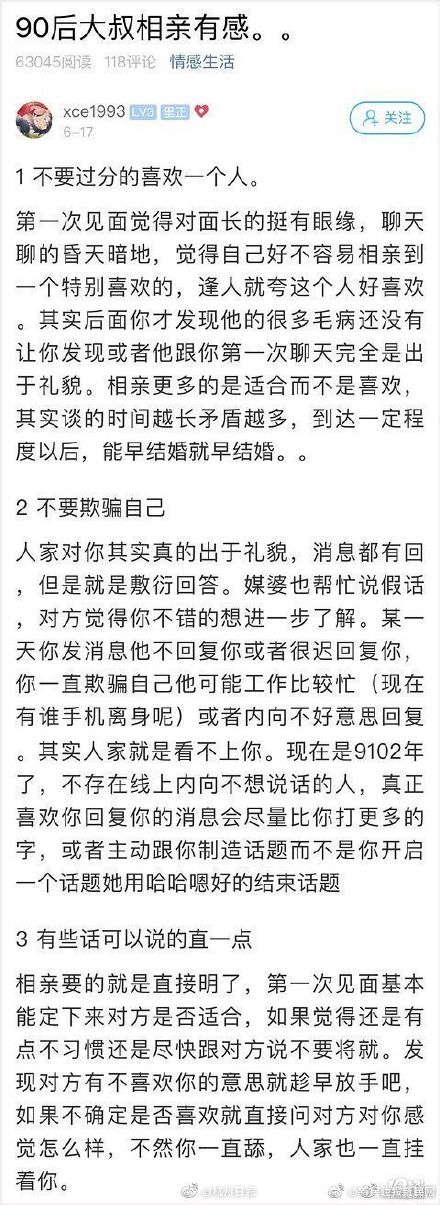 【杭州90後小夥總結相親神攻略 看完第六條紮心了……】最近,蕭山一自稱「90後的大叔」的網友,經歷一系列相親之後,在網上po文總結了6條自己的相親經驗,可以說條條都是經驗之談,但是看到第6條真是紮心了你們有沒有共識? via杭州日報