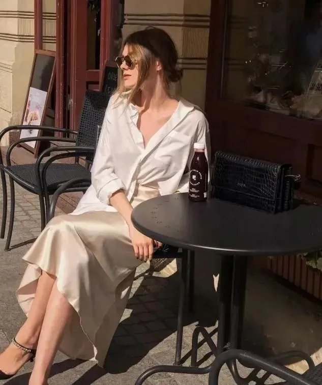 普通的白襯衫已經足以打造時尚氣場,而若想讓純色搭配更加出挑,可以使用富有光澤感的緞面半裙,讓整體更為精緻。