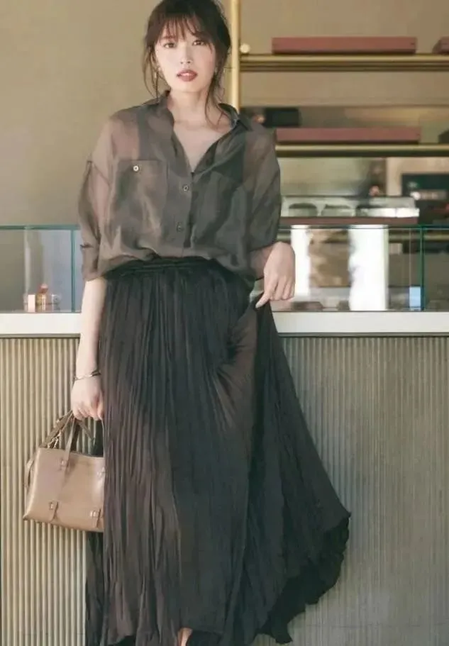 簡約的黑色透視襯衫+黑色百褶裙:和同色系吊帶搭配起來的時候,襯衫就是性感無敵的存在。透視設計減輕了厚重感暗,讓黑色有了一絲輕盈,搭配同樣充滿韻味的百褶裙,一舉一動都帶著好氣質。