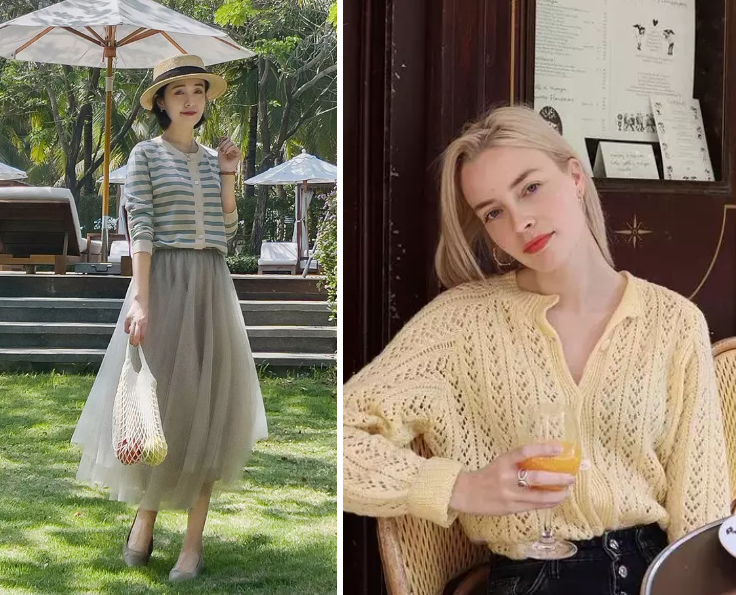 其次,套頭針織衫在搭配性能上不如針織開衫,如果不想讓春季穿衣過於沉悶,用針織開衫來搭配會比較輕盈,可以解開一兩粒扣子,打造出隨性率真的感覺。