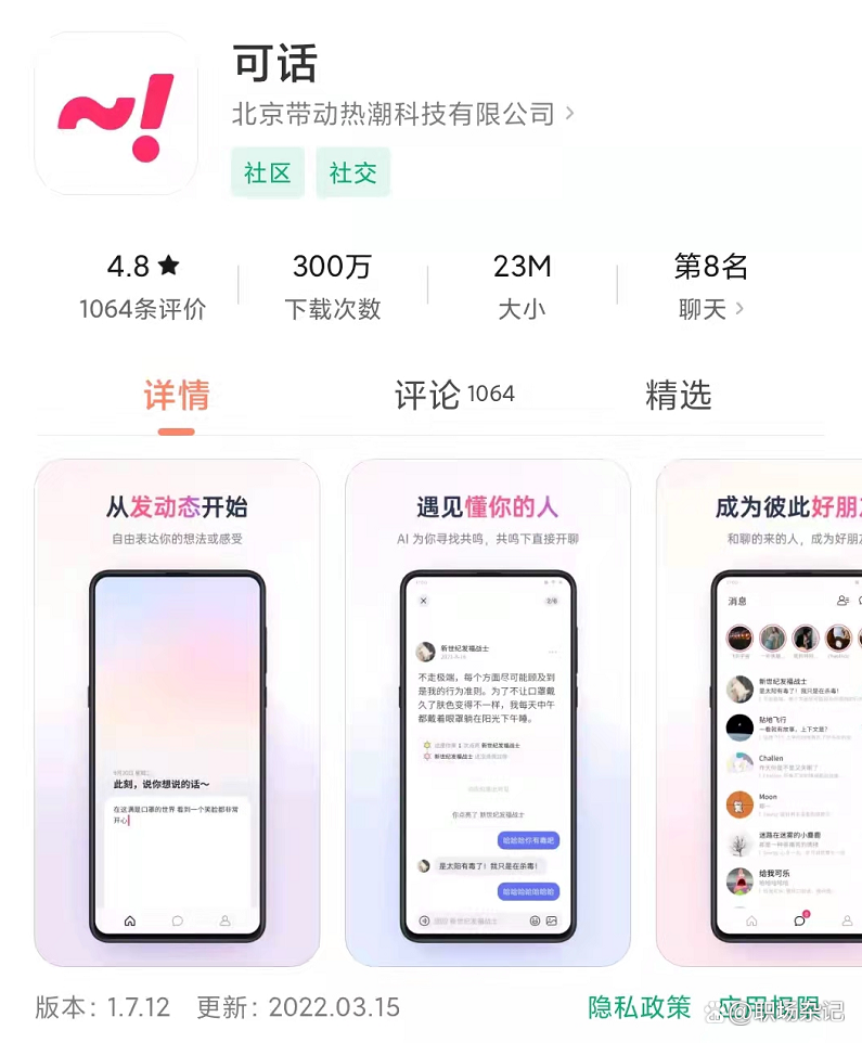 可話是一款走極簡風格的去中心化社交APP,通過用戶動態的內容,利用人工智慧技術尋找和你有共識的人,進而打開點對點社交的大門。它的slogan是「在可話,說你想說的話!」