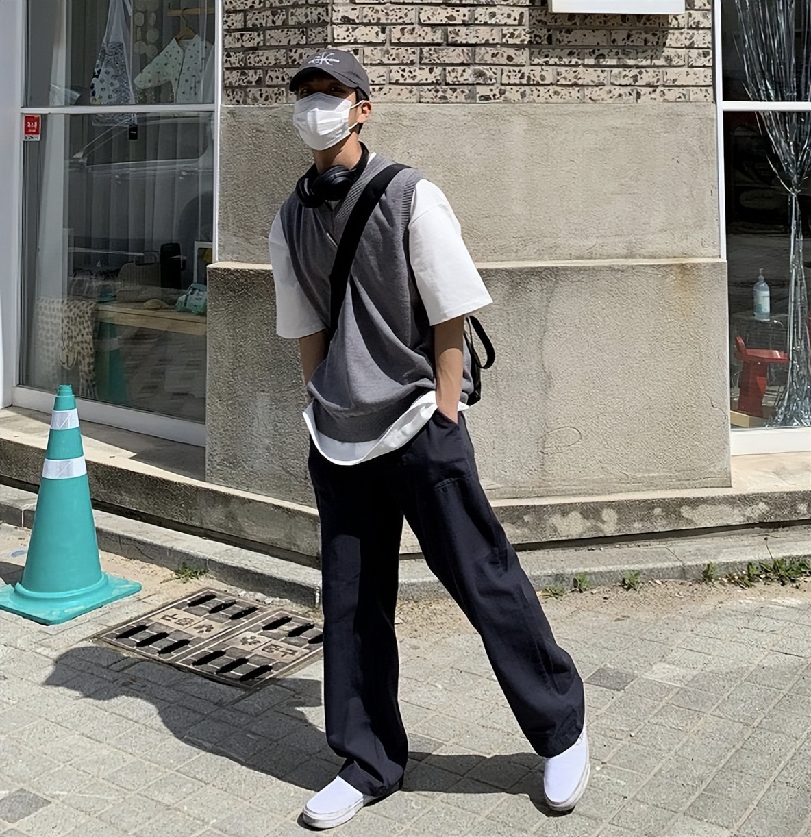簡單乾淨的T恤,對於身高不占優勢的男生來說,衣長選擇很重要。搭配深色休閒褲,視覺上延長腿部線條。腳踩一雙紅色帆布鞋,穿搭更有個性。再加上一件條紋披肩,潮流味十足。▼