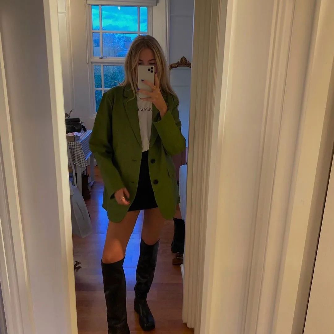 隨意地靠在門框上,拿出手機「咔嚓」一張,秀出穿搭中最有特點的地方。