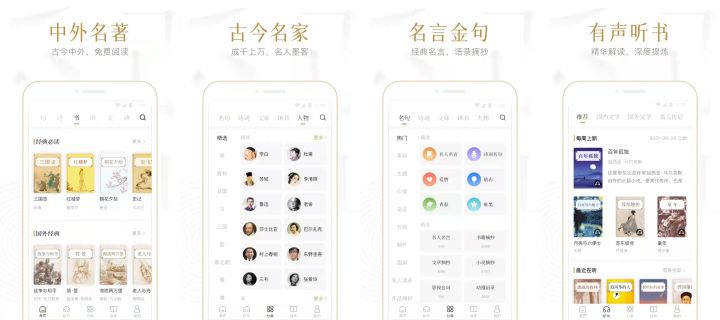 首先,軟體的精選版塊對內容進行了詳細的分類,包括:句、詩、文、書、典 5 個版塊,每個版塊同樣進行了詳細的分類。